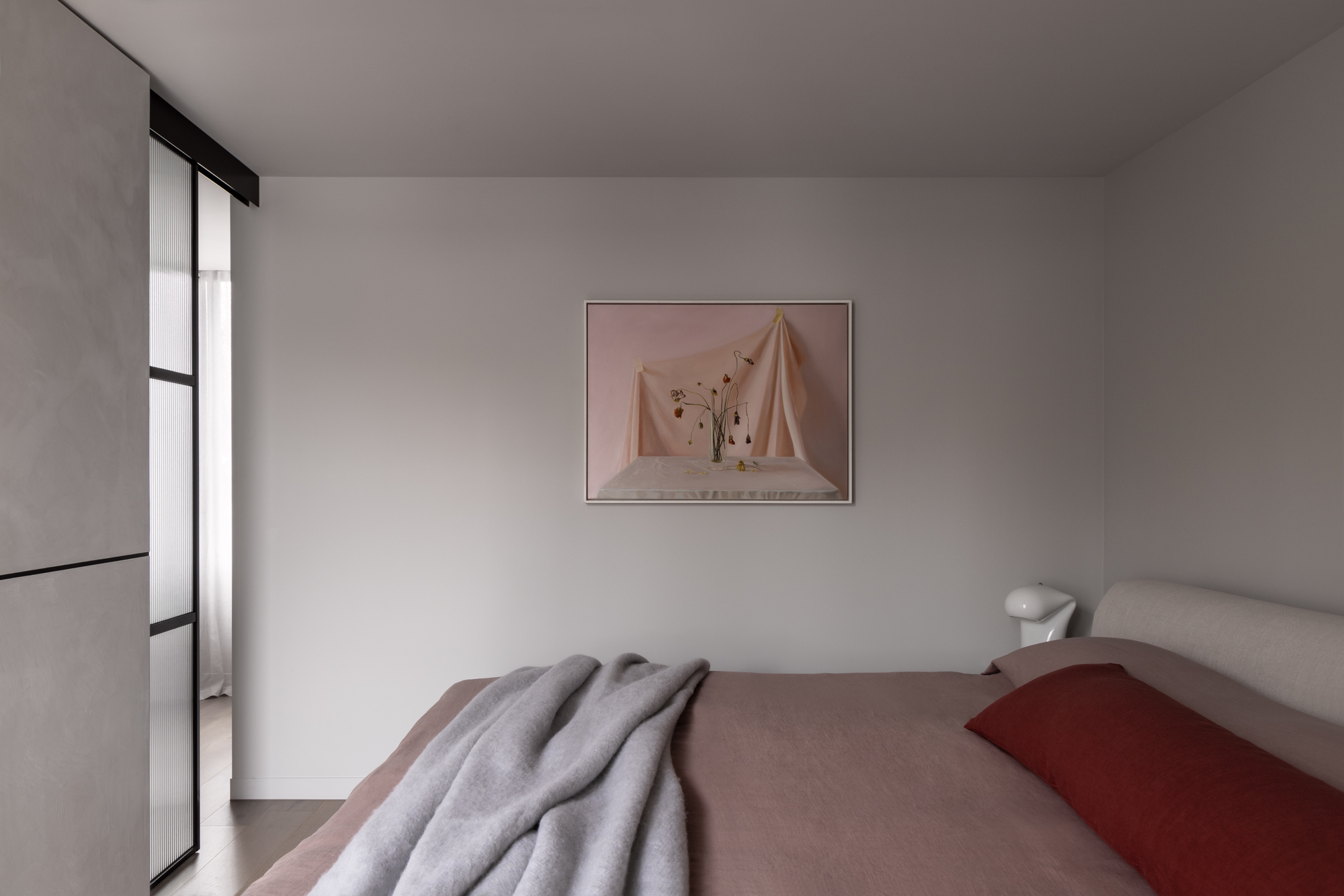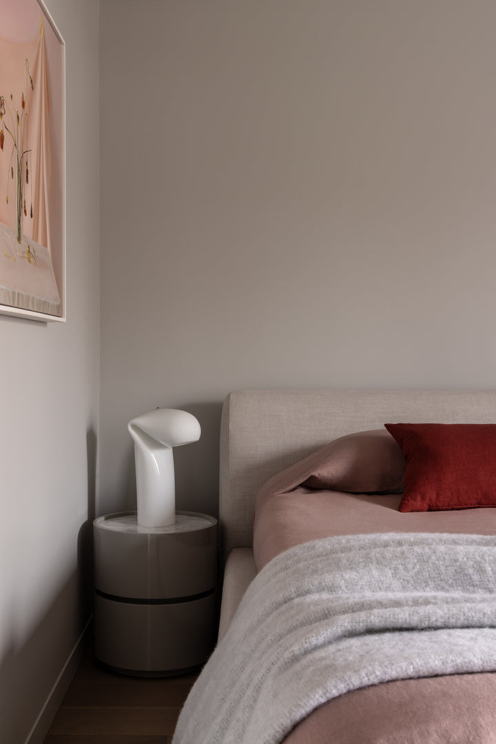The intimate and relaxing room located in a modern South Melbourne home features the bedside Bissona Table Lamp by Vistosi.