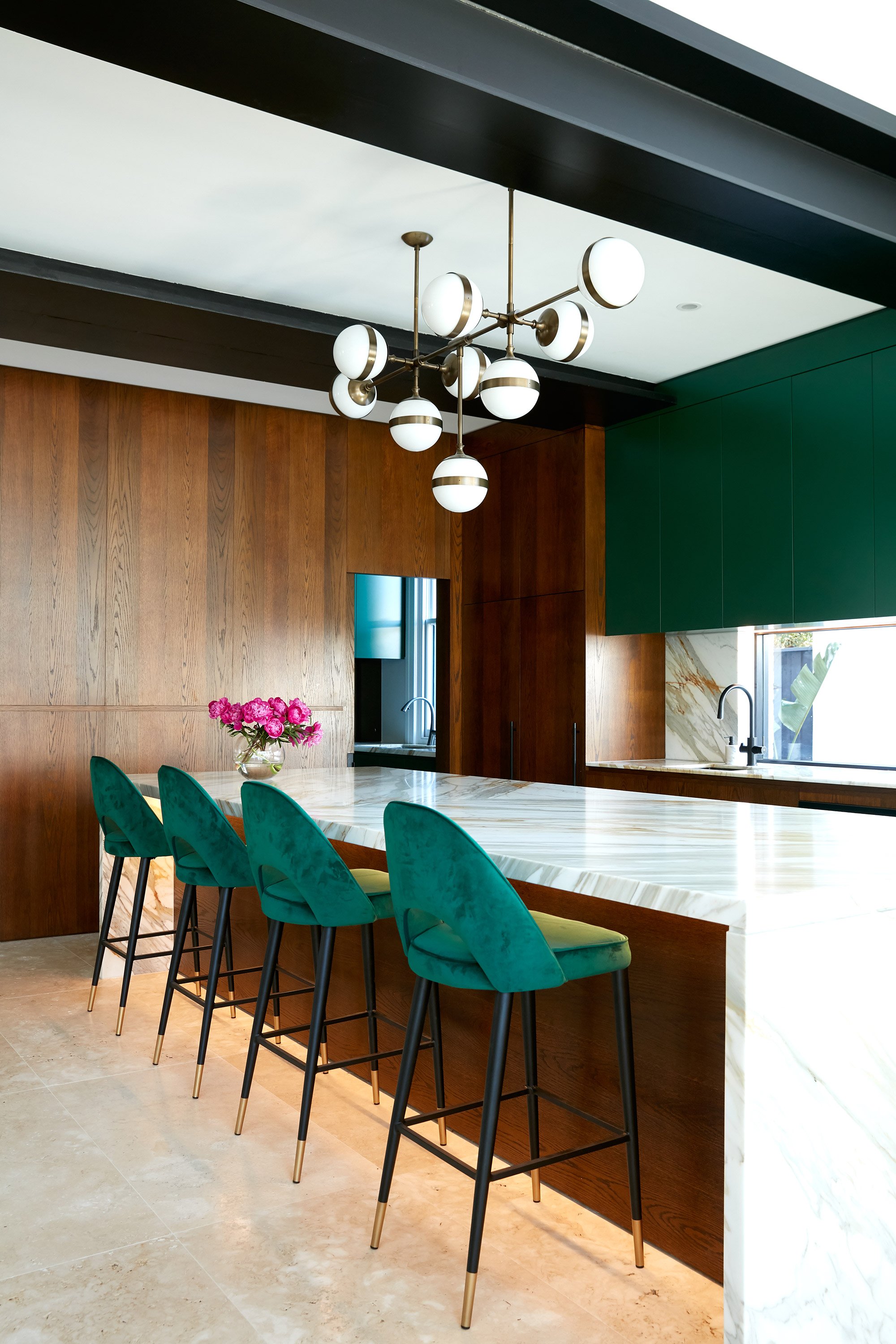 The eye is immediately drawn to the stunning crown cut American Oak timber veneer with custom teak stain which is utilised throughout the space. The kitchen is layered up with Calacatta Oro bench tops, splices of forest green joinery and modern black finishings, imbuing the space with a timeless elegance.