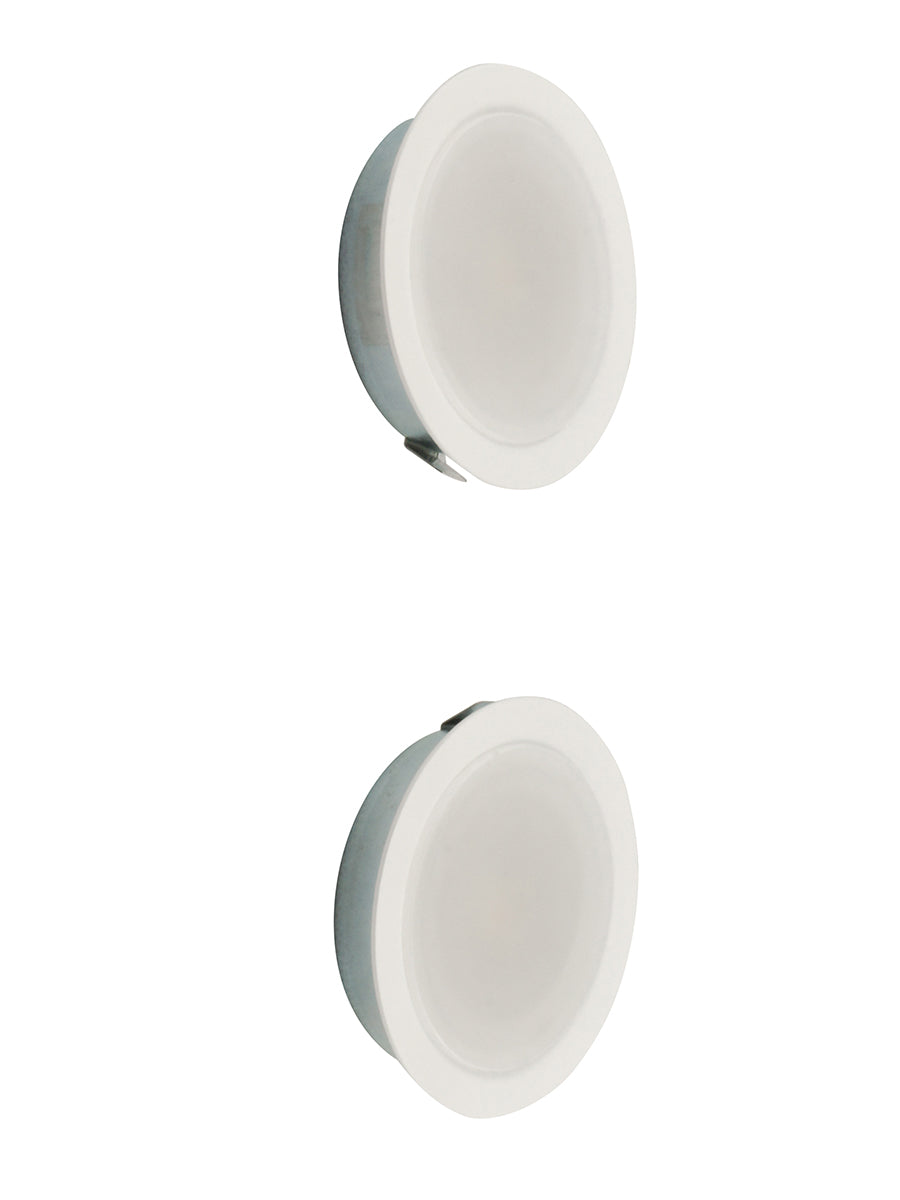 Set of 2 LED shelf lights, each with a 3.5W sharp LED. Supplied with a HEP 350mA non-dimmable driver. Ideal for shelf and cupboard applications. Mounting ring included. Available in white or brushed metal with optional surface mounting ring.