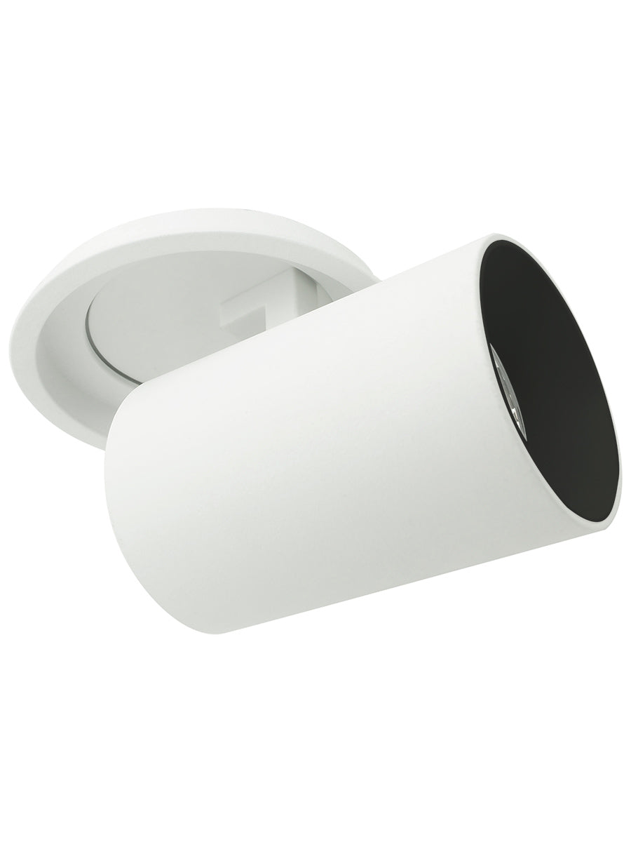Piega adjustable barrel spot light in white finish. Extendable fixture with 350 degree rotation and a 90 degree adjustable angle. CREE COB 12w LED, 3000k, 900lm, CRI 90, dimmable with 38 degree beam spread. The adjustability of the Piega fixture makes it ideal for a wide range of residential and commercial applications.