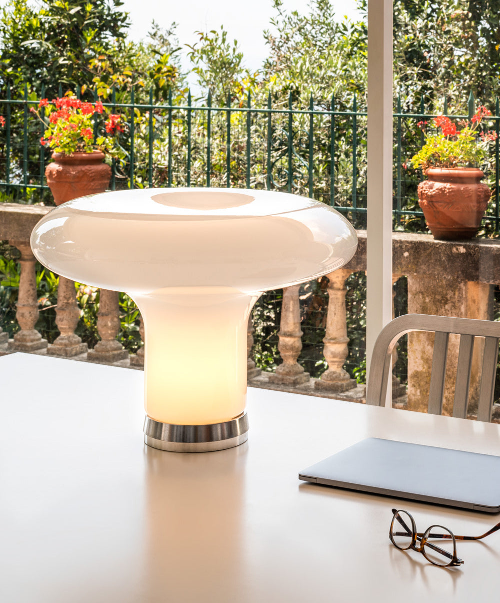 An icon of 1970s Italian design, the Lesbo lamp is celebrated for its hand-blown mushroom-shaped diffuser. The frosted white glass gently conceals the light source while directing illumination upward, creating a soft, atmospheric glow that highlights the glass's organic beauty. A masterful interplay of form and light, this timeless piece remains a symbol of artisanal craftsmanship and mid-century elegance. Originally designed in 1967 by Angelo Mangiarotti. Made in Italy by Artemide.