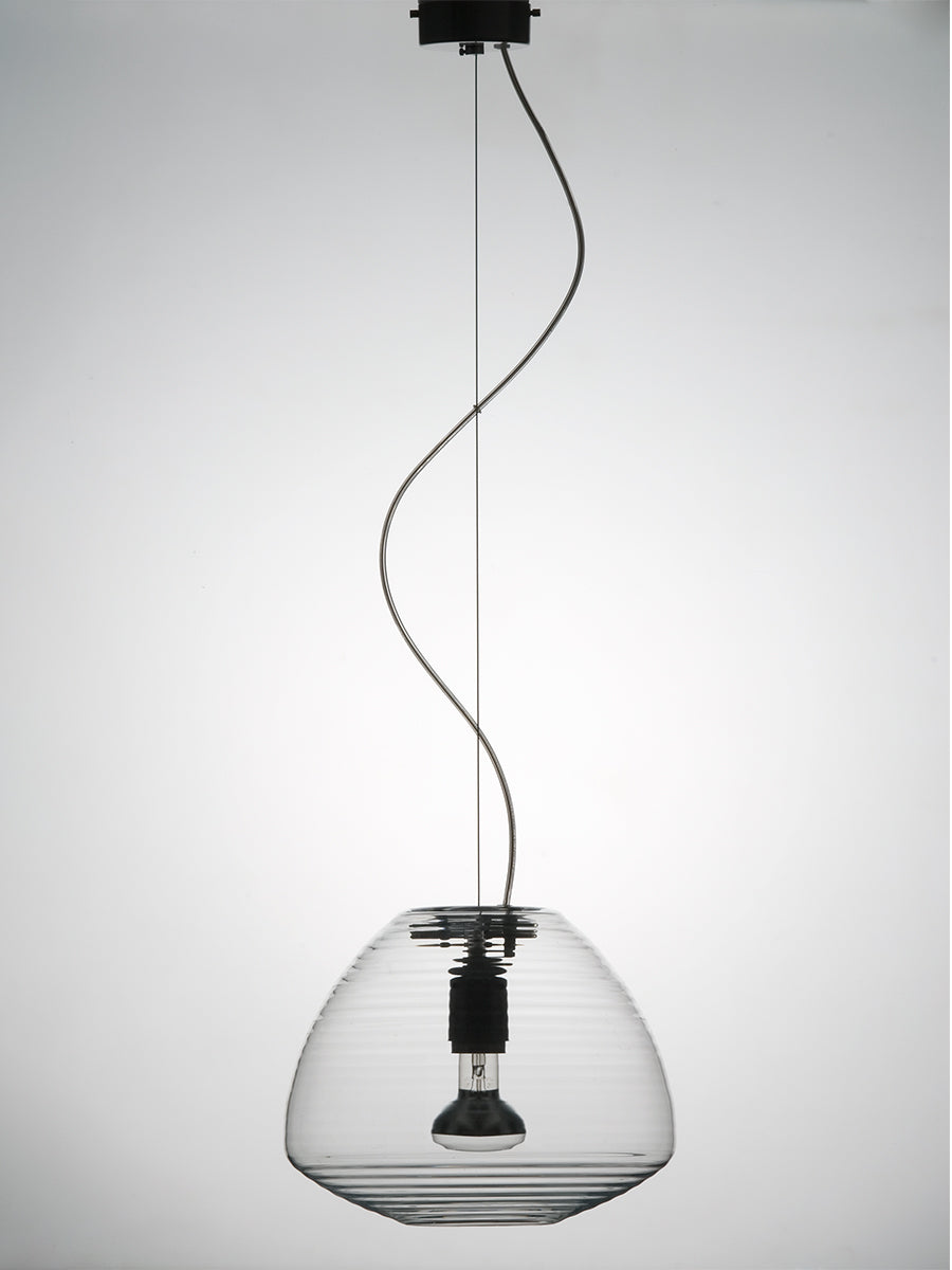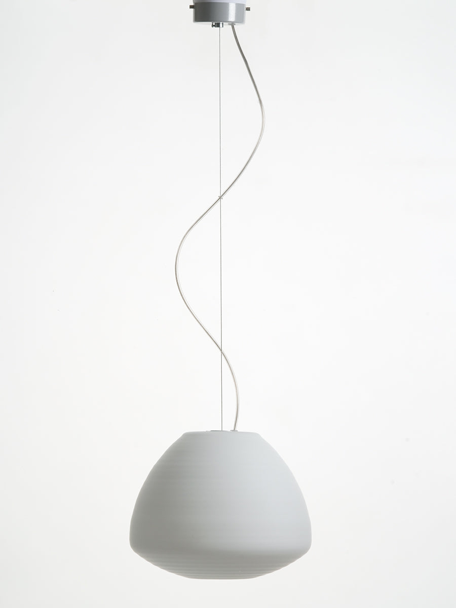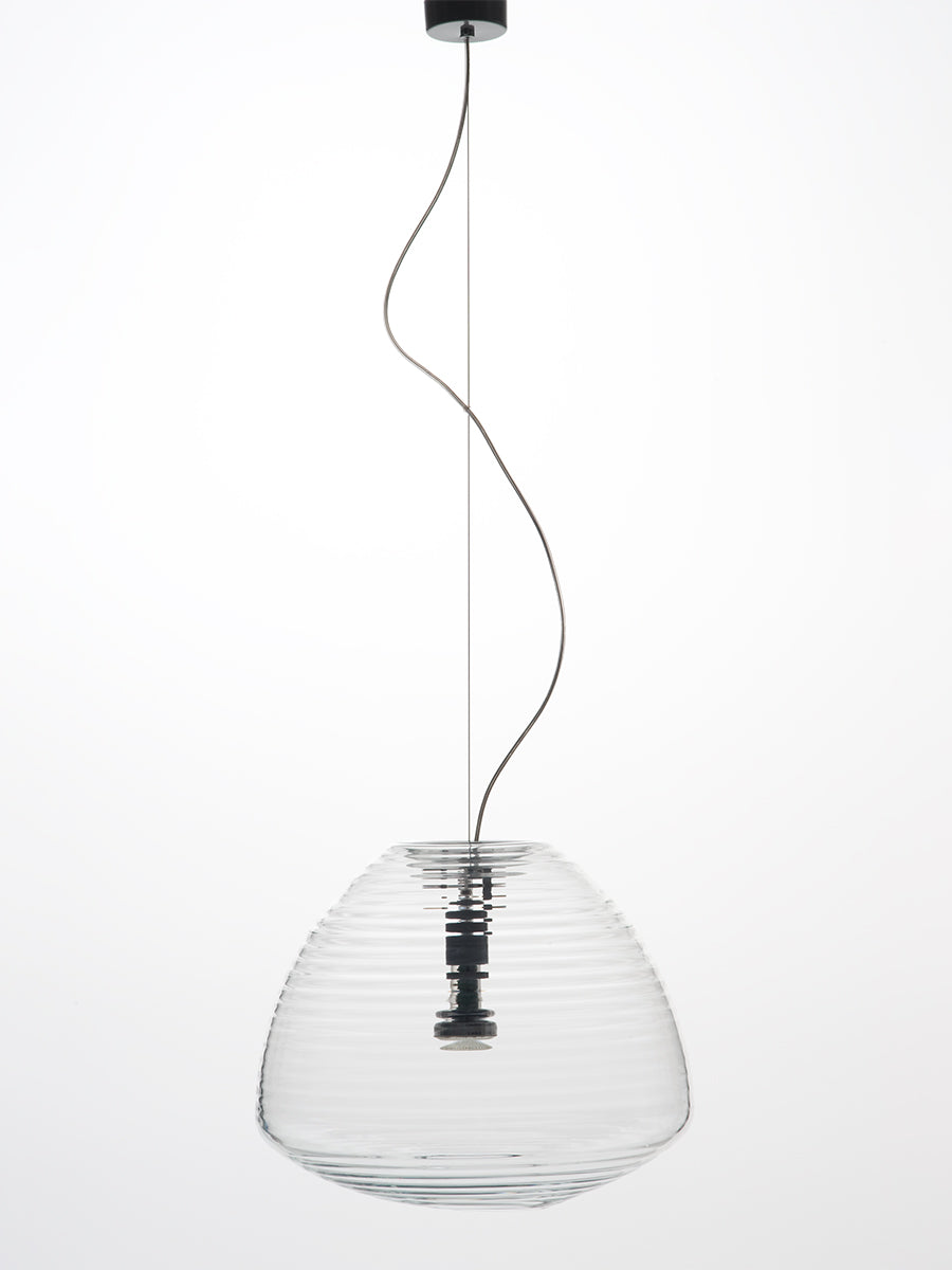 The Perseo pendant is inspired by the look and feel of Japanese paper lanterns. The rounded blown glass diffuser is masterfully crafted with faceted surfaces evoking the sculptural tastes of Isamu Noguchi and his work. Perseo is available in three sizes in satin white or transparent finish. Design by Michele De Lucchi.