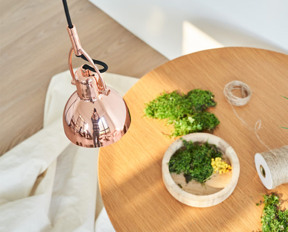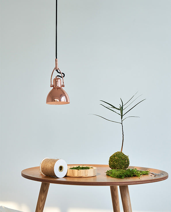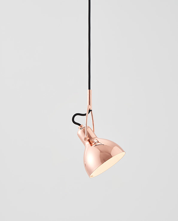 A mini version of the pacific pendant. The wishbone-like structure supplements it's classic style while providing adjustability and balance. Available in copper or black finish with black flex.