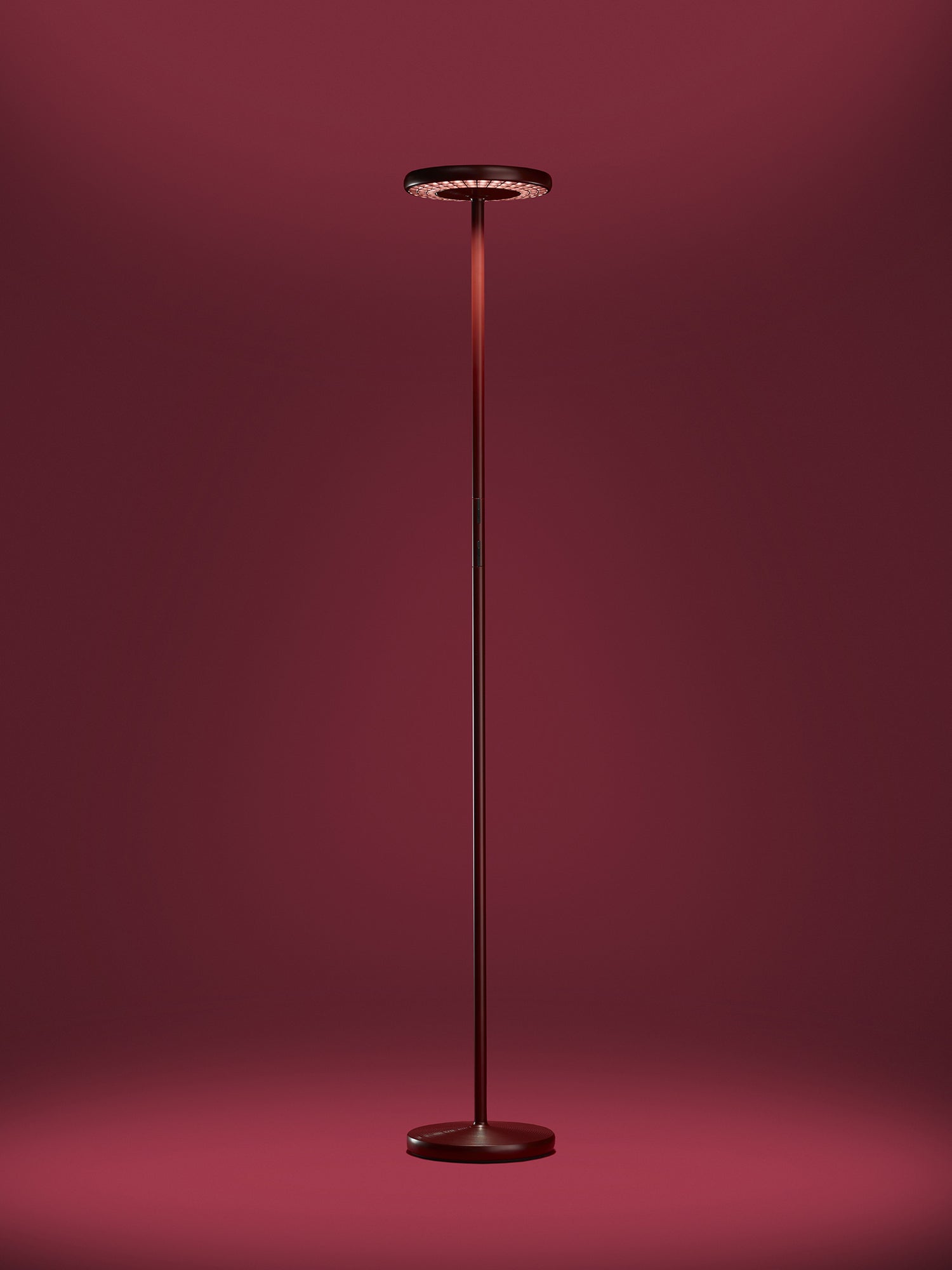 Paolo Rizzatto's SOL floor lamp adorns a new color conveying passion, land, and tradition. The colour ROSSOMOSTO, a dark and deep burgundy, is inspired by the Rotaliana Plain, the beating heart of wine production in Trentino, Italy and where manufacturer Rotaliana resides.