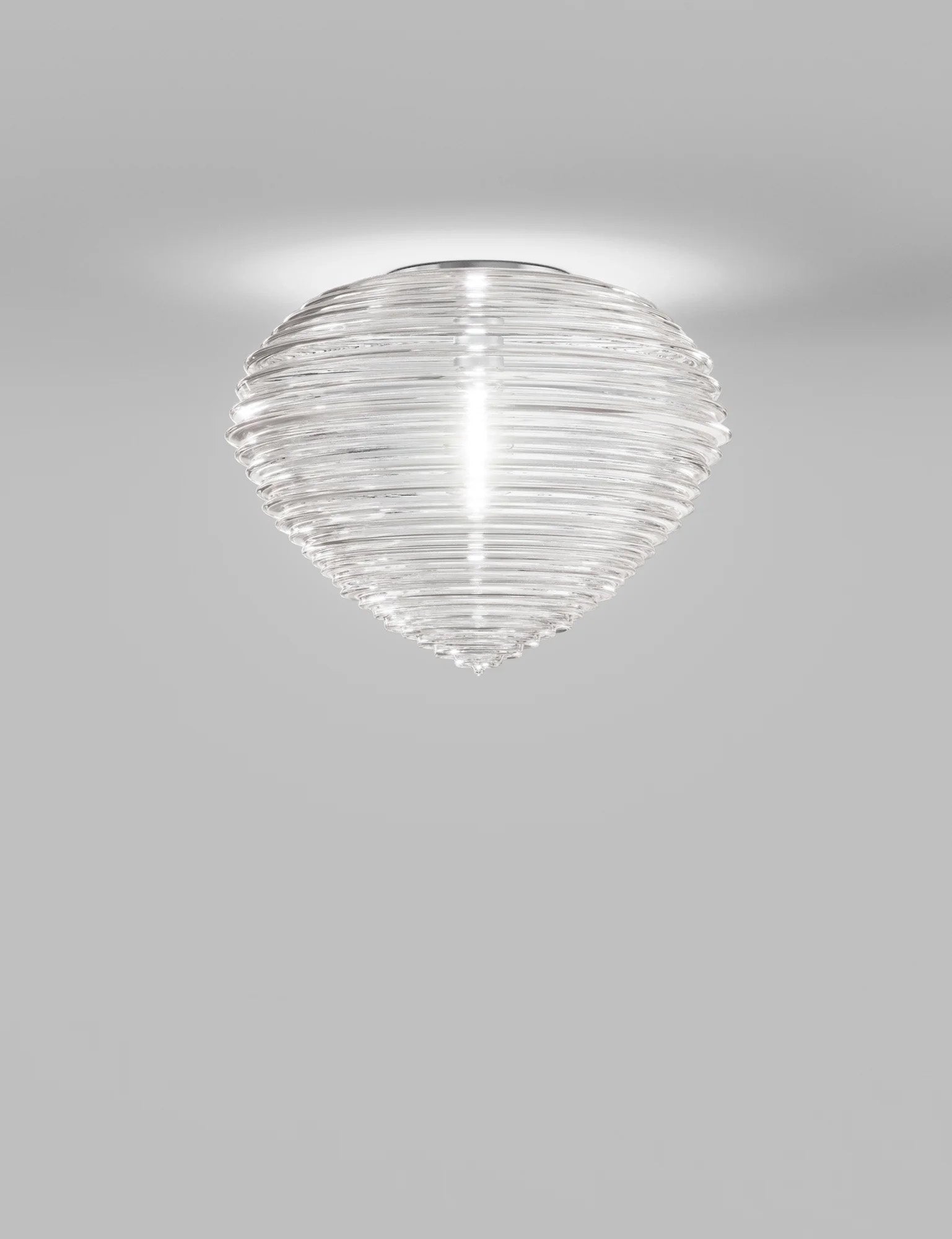 Designed by Marco Acerbis for Vistosi, the Spirit Ceiling Light is inspired by the elegant shape of a diamond. The delicate folds which give the Spirit it's characteristic look are the result of a long process of development, creating a unique light reflection while concealing the light source. Made with mouth blown glass in Italy. Spirit is surface mounted for wall or ceiling installations. Available in 2 sizes in transparent crystal finish. Please note that this transparent crystal version of the Spirit ceiling light is discontinued with very limited stock. The white version of the Spirit remains in production and is found in our general catalogue.