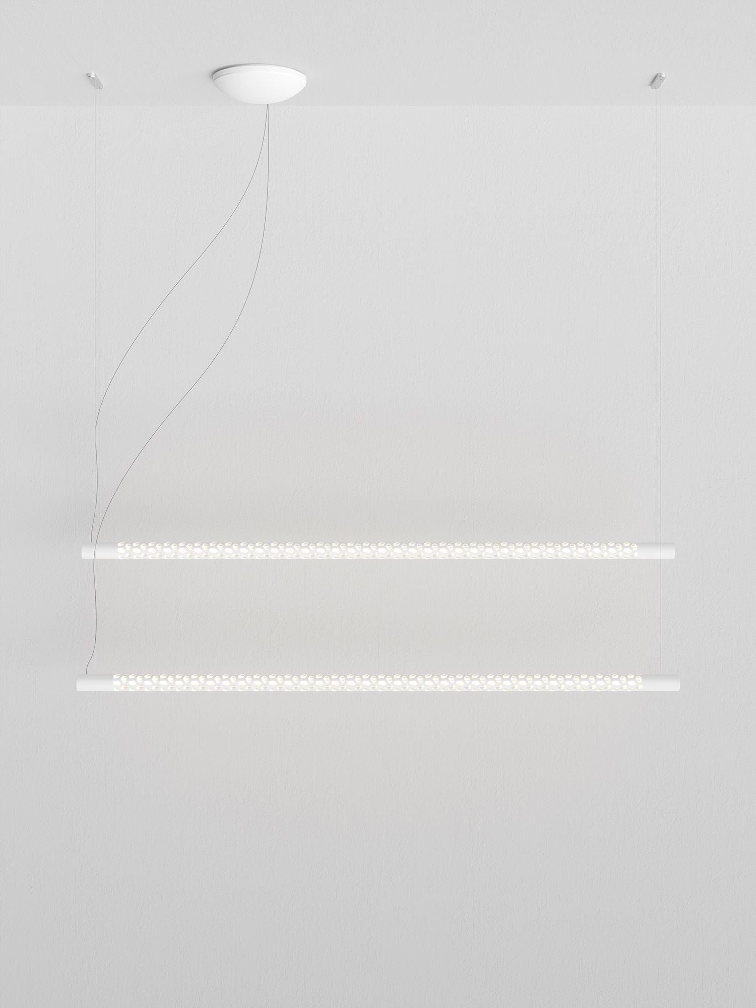 Inspired by the "Neon structure" by Lucio Fontana for the 9th Triennale of Milan, Squiggle is a suspended tubular exoskeleton containing an LED strip up to 6m long. A sequence of irregular hexagon-shaped holes allow light to escape the metal structure, projecting a complex array of geometric patterns, including broken curved lines and concentric rings. Squiggle comes in a wide range of designs and sizes to suit a myriad of installation possibilities, with all versions available in matt gold, black or white finish. Made in Italy.