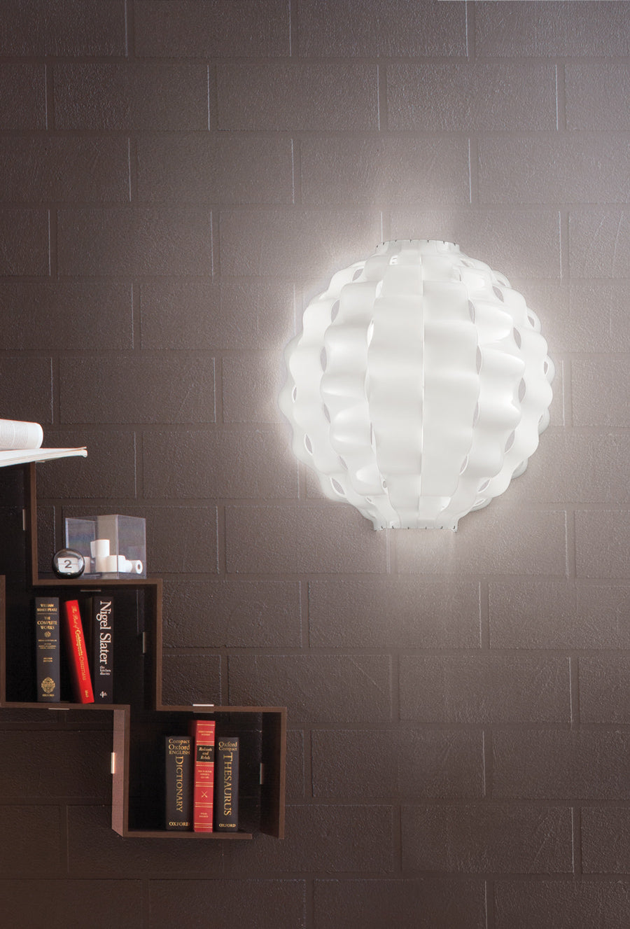 Tahoma surface mounted lamp composed of vertically arranged layers of glass that create a spherical shape. Can be installed as ceiling or wall light. Available in glossy white finish. Made in Italy.