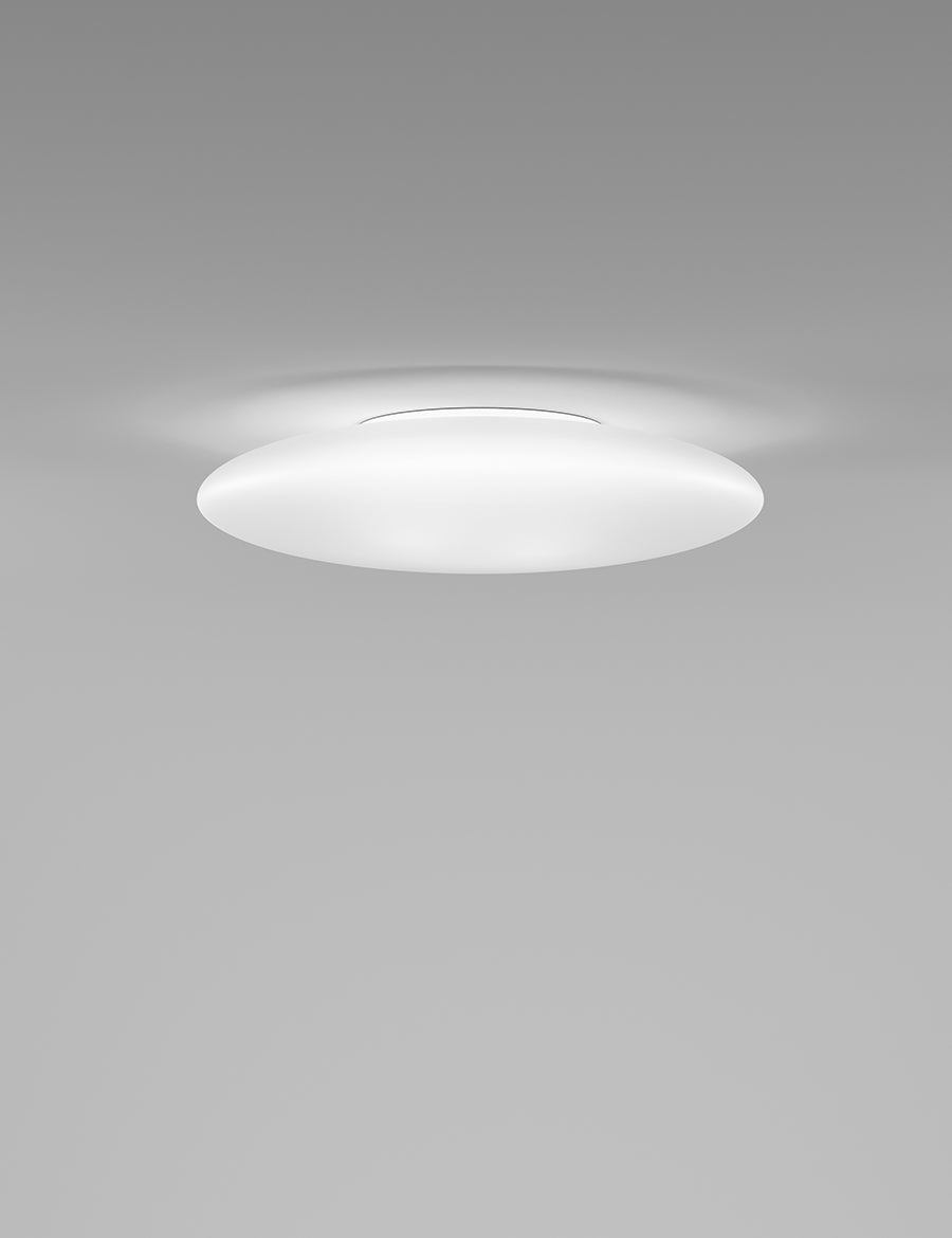 Saba is a simple and elegant fitting that can be mounted both as a ceiling or wall lamp. The lenticular shape of the satin-finish blown glass makes it an excellent choice for ambient lighting. Available in four sizes.