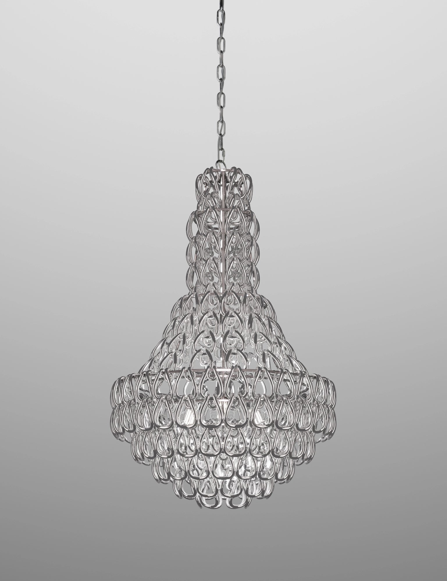 The Minigiogali collection from Vistosi expands Angelo Mangiarotti's classic Giogali range through utilising smaller hand made crystal links, providing additional style options. The Minigiogali Classic Chandelier comes with a bronze or chrome frame and a variety of different link colour options. Ideal for feature lighting installations in residential and commercial projects.