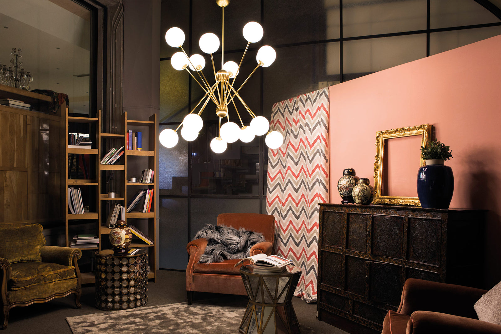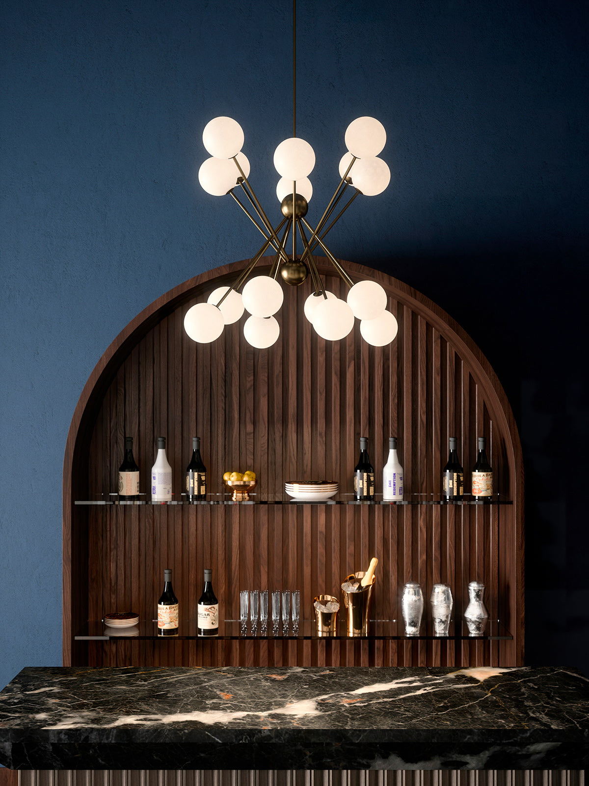 Scarlett by Cangini e Tucci is a modern expression of traditional shapes. Blown glass spheres are equilaterally arranged on two planes via an intersecting metal frame, creating a striking symetry. Entirely handmade in Italy, the Scarlett chandelier is available in three sizes with multiple finish combinations.