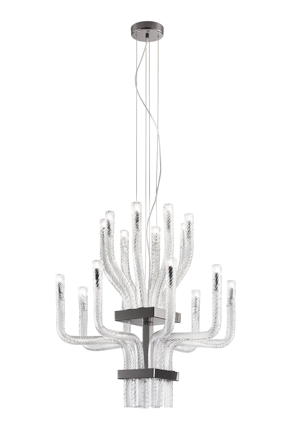 Evoking visions of star lit night skies, the Stardust Two Tier Pendant features a network or arms made of mouth blown and handcrafted crystal glass. The metal frames hide an original fastening system of the arms and cabling system, for a clean and elegant look.