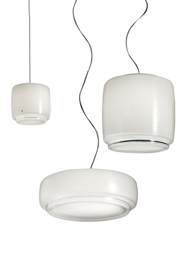 The timeless elegance of Murano blown glass is realised in the BOT pendant by Vistosi, in which the incandescent glass contains the light before it has a definitive shape. The simple shape of the pendant makes it perfect for both residential and commercial interiors. BOT is available in 3 sizes in white finish with a clear front edge.