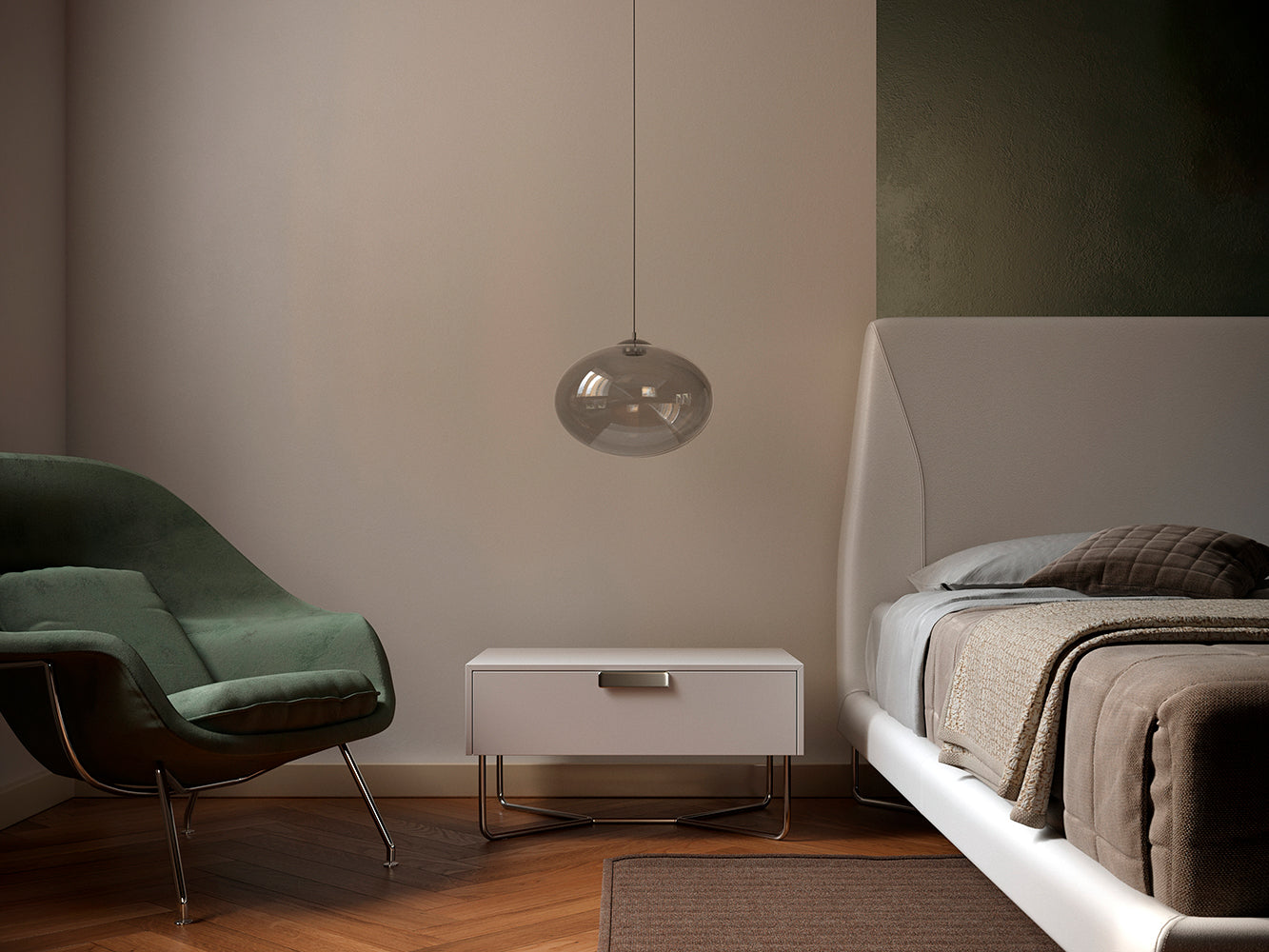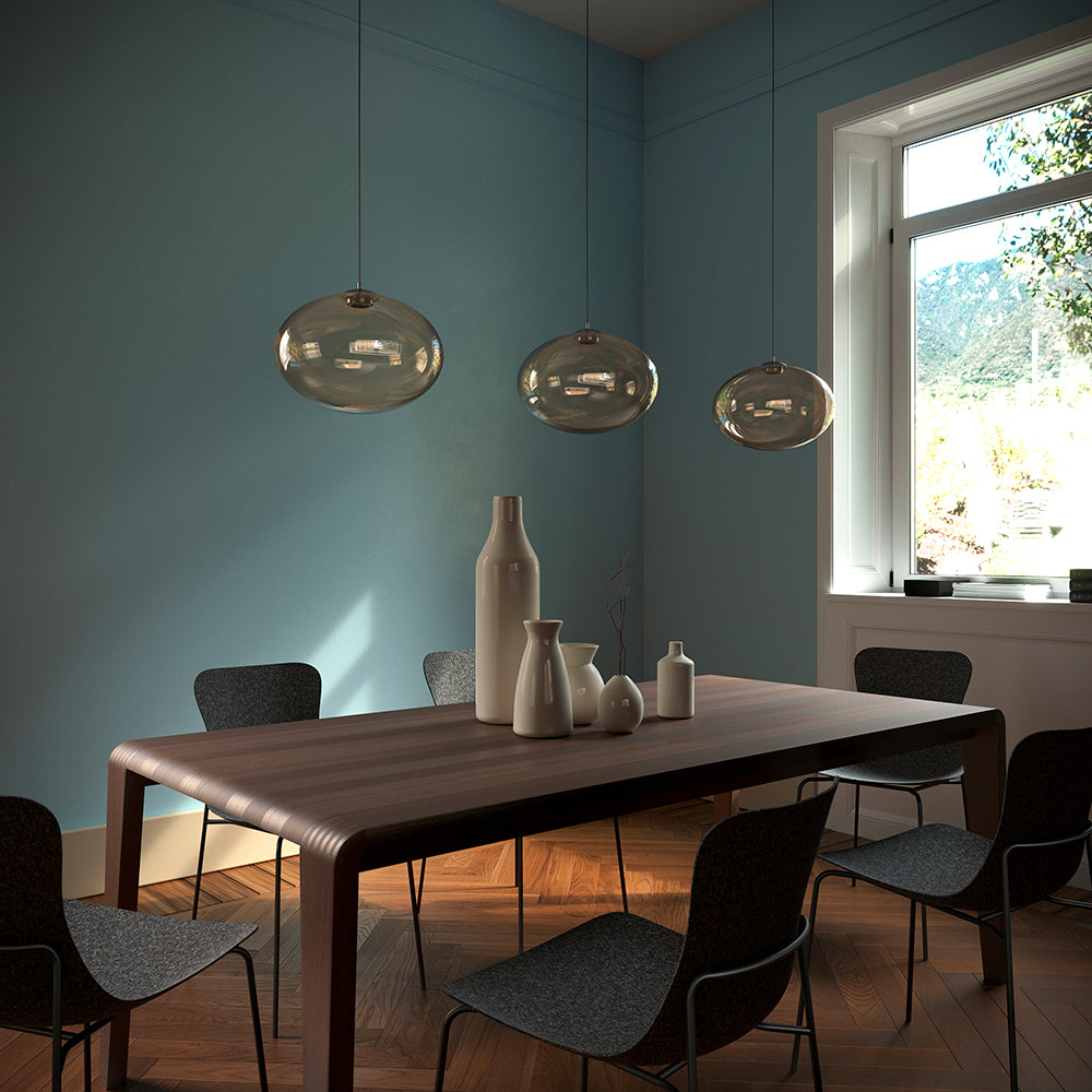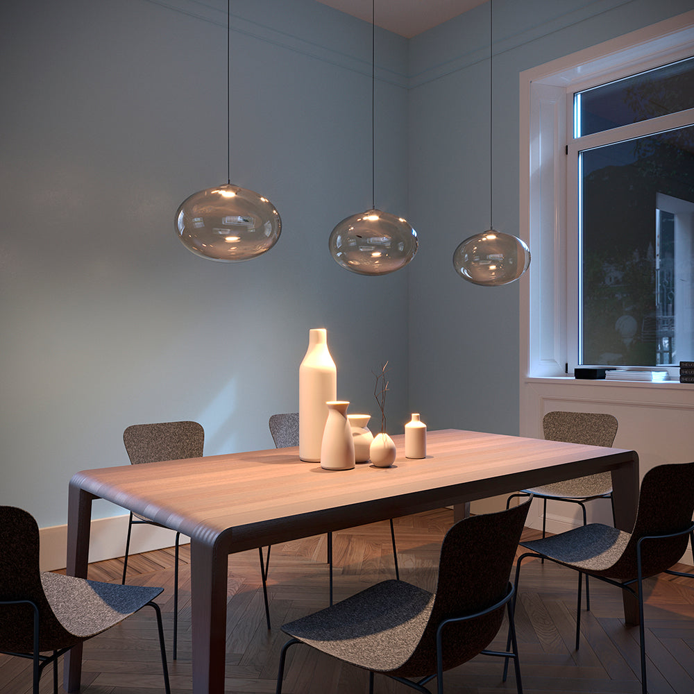 GEO, a blown glass pendant lamp handmade in Italy by Cangini e Tucci, features a spherical glass body with a slight flattening at the poles, creating an elegant ellipsoid shape. This minimalistic design is illuminated by a high-power LED module at the apex, offering exceptional lighting quality and a unique play of light and shadow on the glass surfaces.