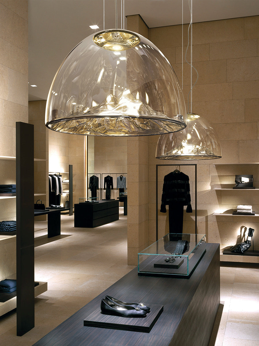 The Mountain View Pendant Light is an enchanting fixture that will become the focal point of any room. Made of transparent blown glass masterfully hand-crafted. The shade consists of two parts: a simple dome encompassing dome with a majestic mountainesque structure located within, evoking visions of mountain ranges. Available in a variety of finishes, the mountain range glistens from all angles just like a real mountain would in the sun via a dedicated LED light source located at the top of the shade. This beautiful, decorative pendant light adds an ethereal effect that is perfect within both residential and commercial spaces. Design by Dima Loginoff for Axolight.