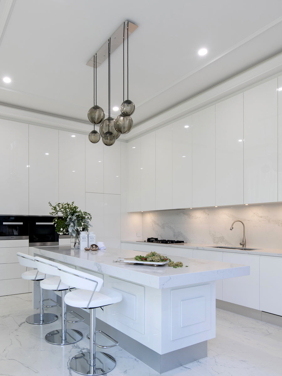 Contemporary lighting system featuring up to 9 hanging mouth blown crystal pendants, suspended from a linear mounting plate affixed to the ceiling. Every version of the PUPPET LINEAR utilizes a combination of small, medium, and large sphere pendants to create an elegant composition. Each glass diffuser features an irregular lined degrade finish, producing a soft cloudy pattern on surrounding surfaces. Available as 6 or 9 light. Each version avail-able in various colour options.