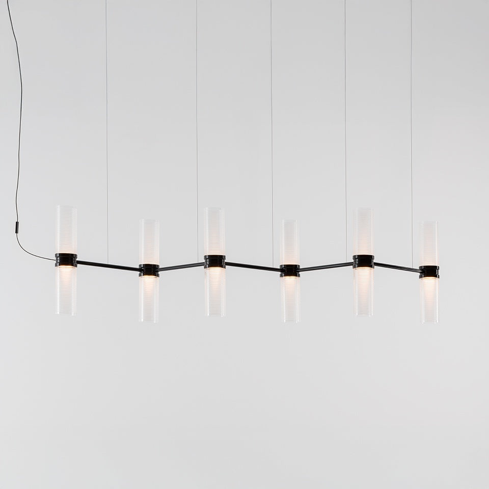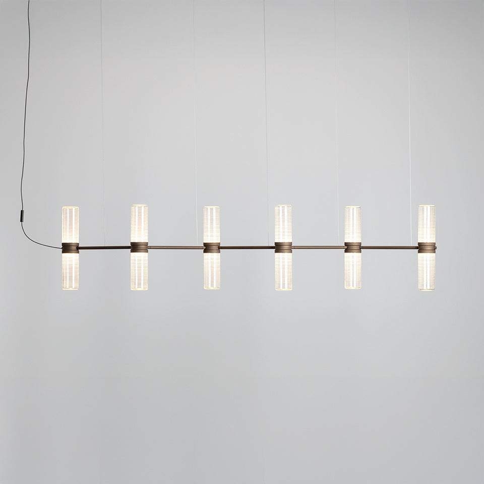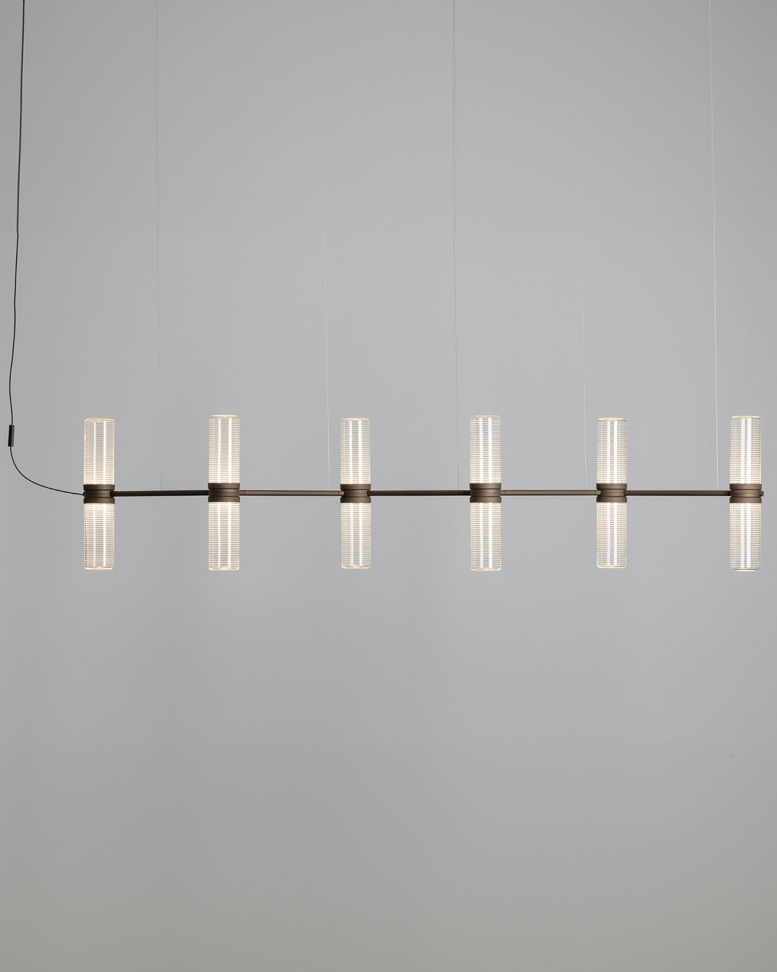 The Artemide Zephyr is a minimalist and elegant pendant that reinterprets the traditional chandelier with contemporary sophistication. Designed by Carlo Colombo, Zephyr features a modular frame system that enables infinite custom layouts to suit the specific needs of each project. The distinctive modular element comprises a double cylindrical diffuser with a central body that encloses the integrated LED light sources. Through two innovative rings that rotate on the same axis, the system defines the position of neighbouring lighting bodies by precisely positioning the connecting structural elements. The hand-blown glass diffuser creates a horizontal texture for glare-free diffusion. This linear suspension delivers 55W of power with 4093lm of warm 3000K light. Available in black or bronze finish with PUSH/DALI or APP controlled dimming. Made in Italy.