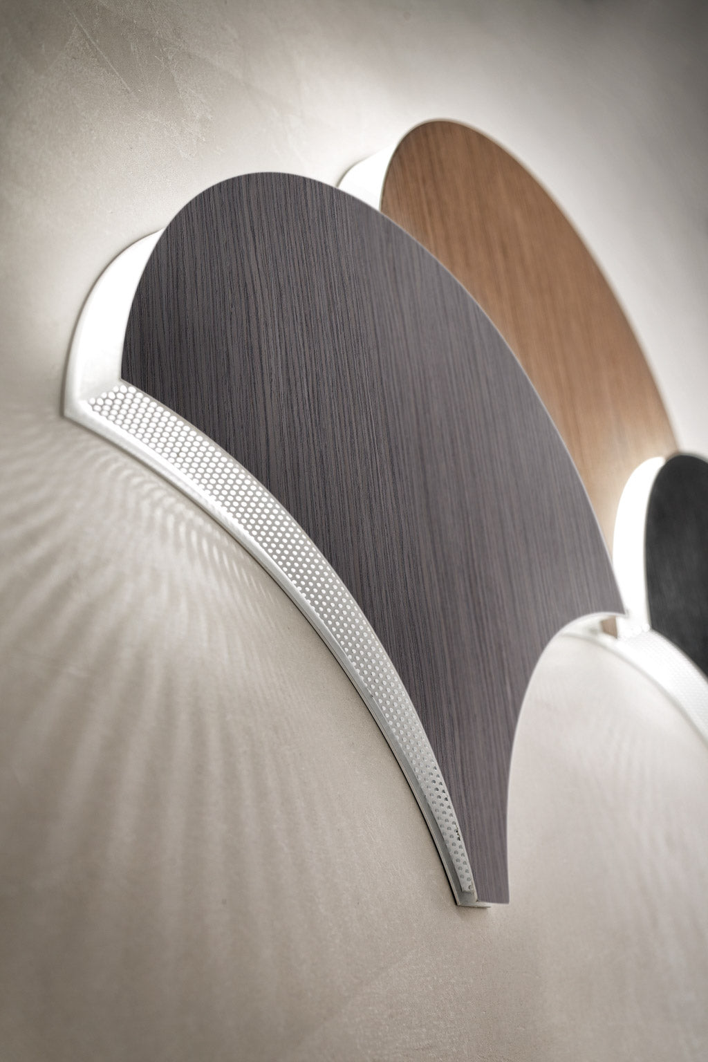 The Palm applique is a modular wall system reminiscent of the overlapping leaves of a palm tree. Palm's modularity makes it highly adaptable for feature lighting applications. Made up of interlocking shapes, Palm is backlit via an LED source for indirect illumination. Available in a variety of finish options and two sizes. Made in Italy.