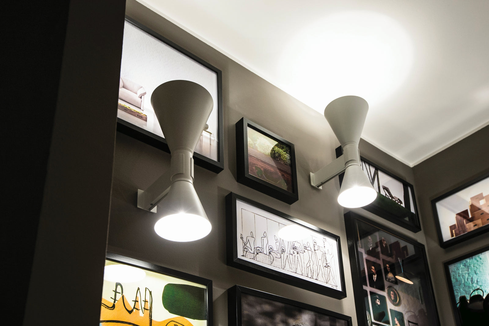 Le Corbusier designed the Applique de Marseille for his Paris apart-ment at Rue Nungesser et Coli. Aluminium wall lamp with double emission painted in Grey (RAL 7046), White Wash (RAL 9002), or Black Grey (RAL 7021) with white internal diffusers. Takes 2 x E27 globes.