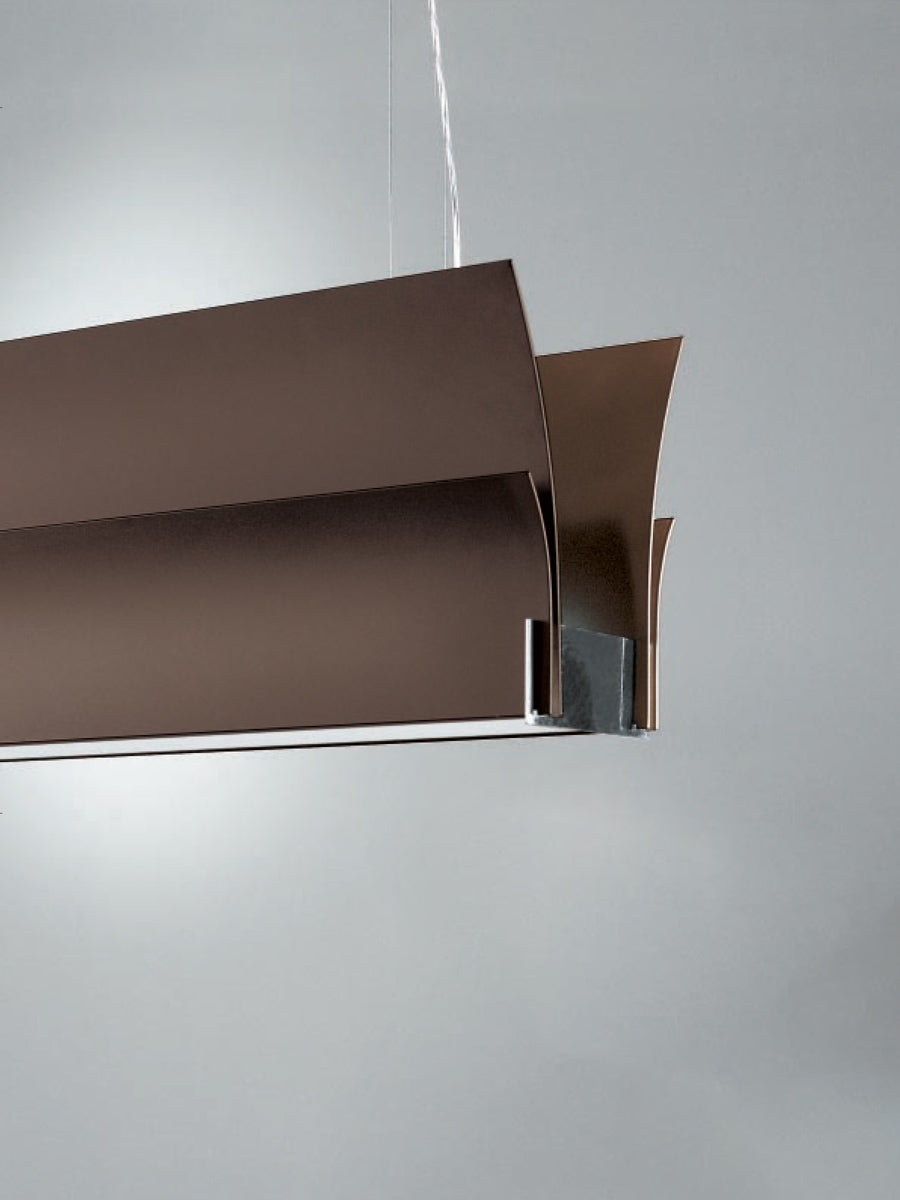 Designer original Balios 90 Pendant Light in tobacco finish. Composed of slightly curved sheets of glass for an elegant indirect illumination. Takes 2 x T5 36W fluorescent globes. Design by Manuel Vivian for Axolight. Made in Italy.