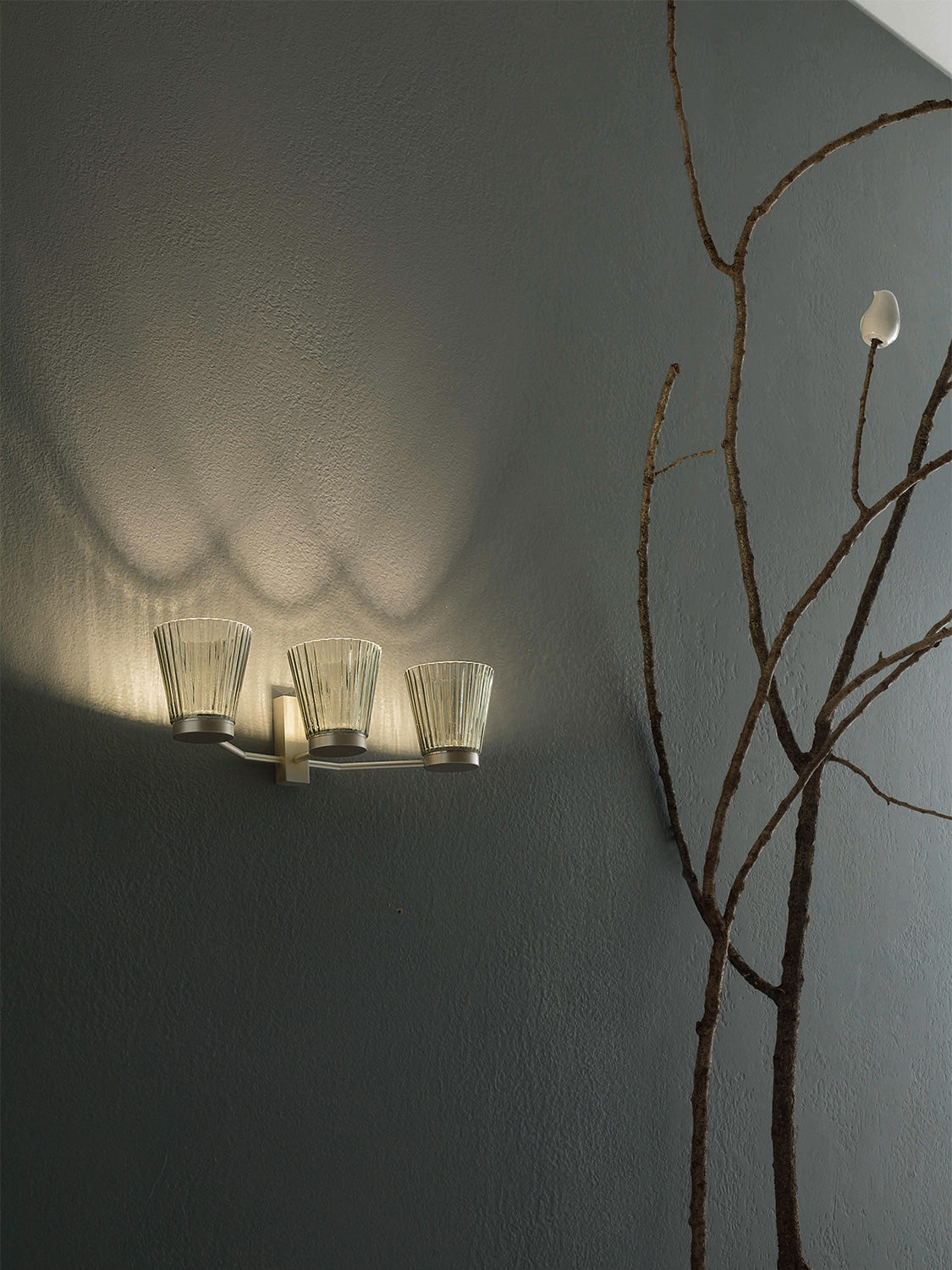 The Canaletto triple wall light from Icone Luce takes inspiration from the past to create a wall fitting for contemporary spaces. A smooth metal base supports three fine glass shades, recalling the elegance of art deco era light fixtures. The Canaletto is well suited to a variety of interior spaces, providing a warm ambient light. Available in painted pewter body with smoked glass diffuser, or brushed brass body with crystal glass diffuser. Manufactured in Italy to the highest quality.
