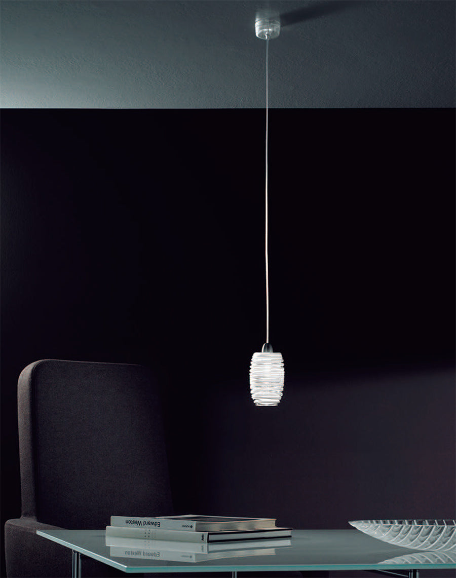 The Damasco pendant light collection is created with the 'bozzolo' technique, which entails manually applying 'threads' of molded glass on a re-shaped element in mouth-blown crystal. Expertly hand crafted in Italy. This version of the Damasco pendant features an end of line finish with very limited stock.