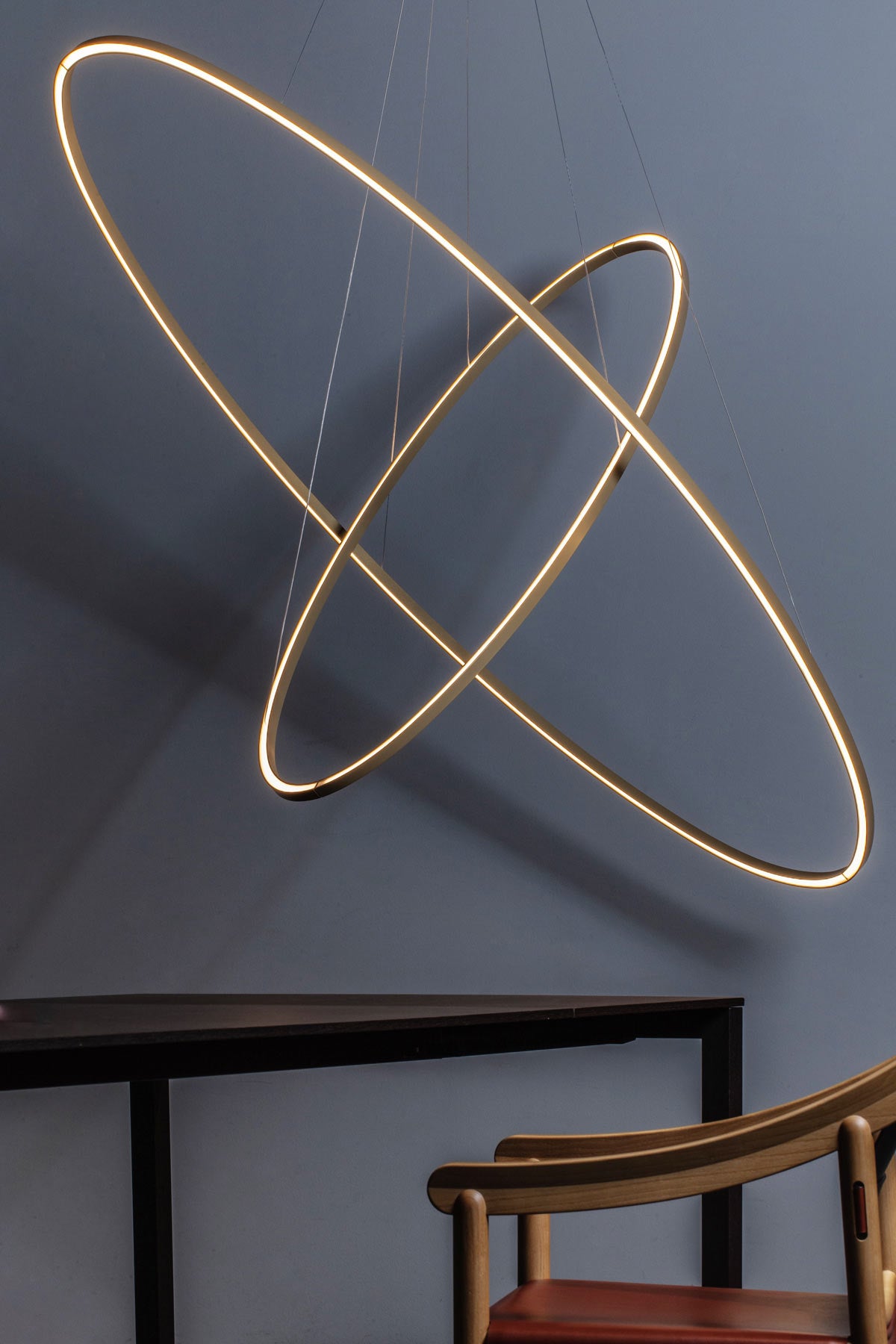 The Ellisse Pendant Double from NEMO is an LED pendant lamp for widespread direct and indirect lighting. Two pendants with opaline diffusers and aluminium bodies hang from a central base to create an overlay effect. Ellisse is manufactured through a proprietary technology to combine the extruded bars.