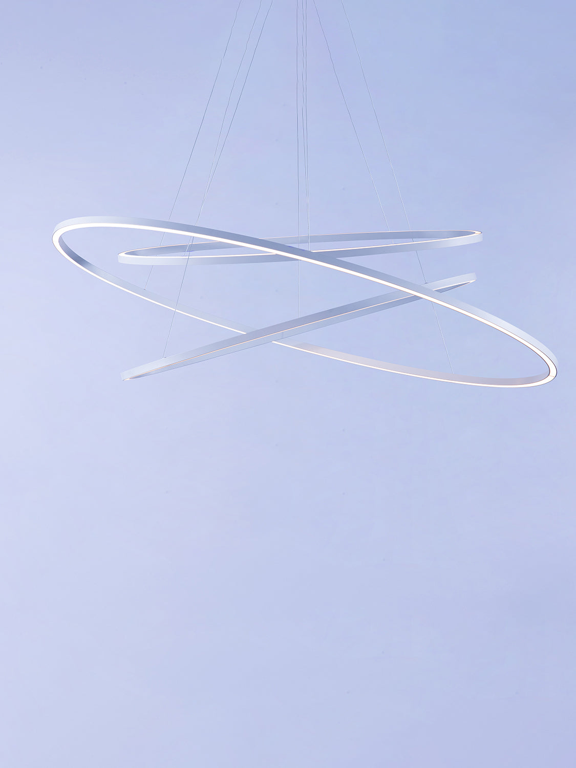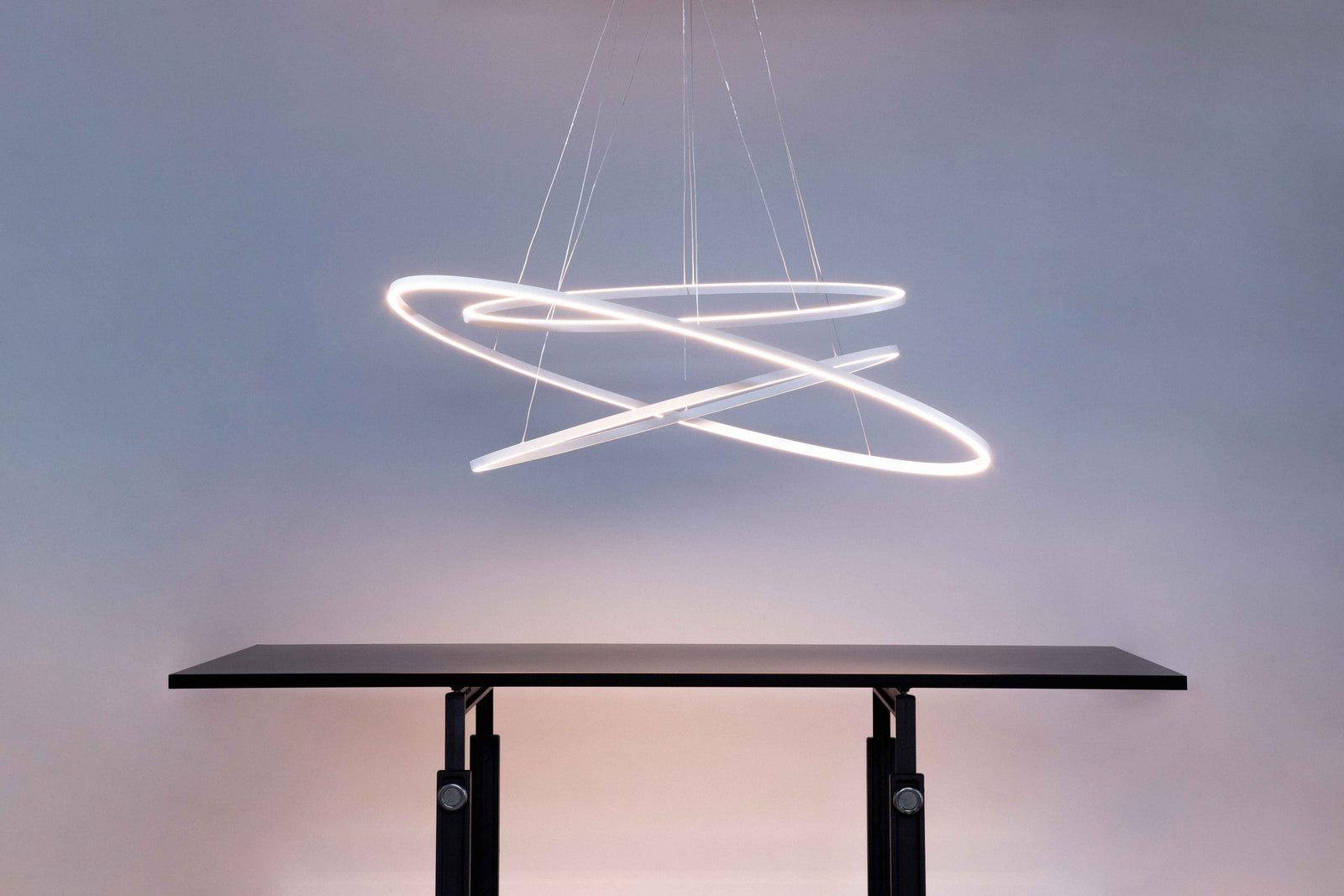Ellisse Triple from NEMO is an LED pendant lamp for widespread direct and indirect lighting. Three pendants with opaline diffusers and aluminium bodies hang from a central base creating a convergence of linear plains for feature lighting applications. Available in black finish.