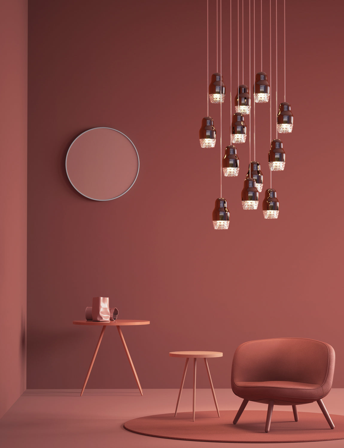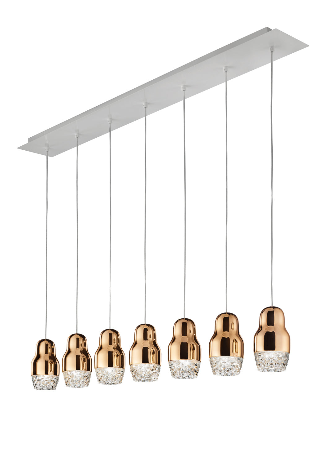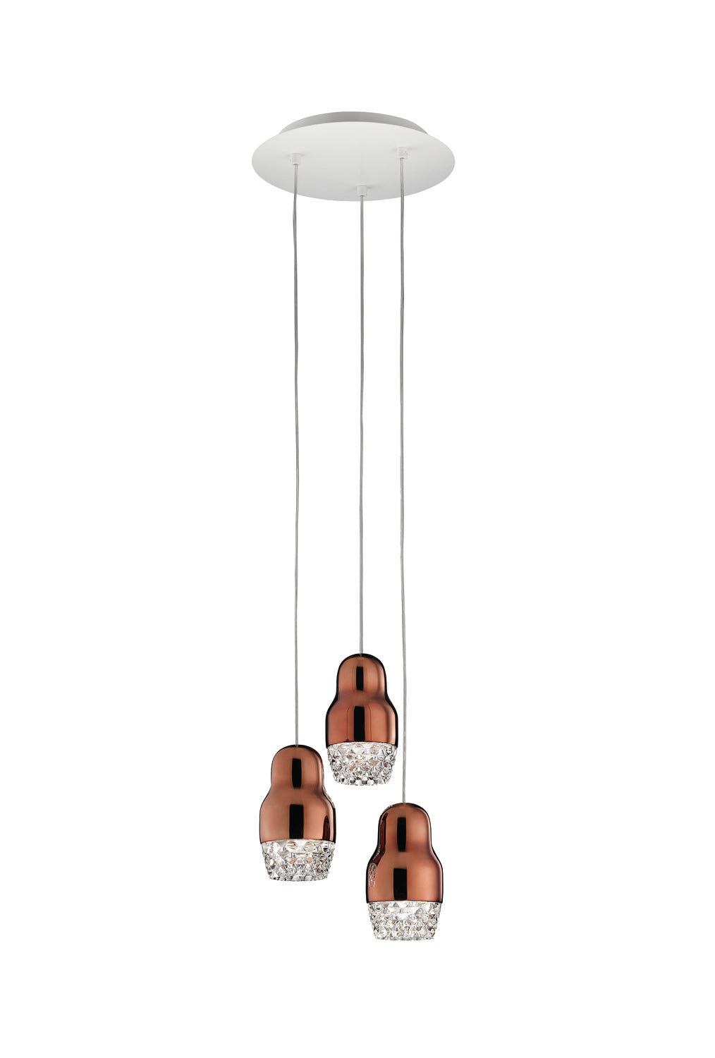 Contemporary and traditional design is combined in the Fedora Suspension Light. Inspired by the Russian matryoshka doll, the transparent geometric detailed glass diffuser is complemented by polished aluminium, exuding elegance within a space. Each pendant light takes 1 x GU10 LED, making it an excellent choice for hospitality and retail applications as well as domestic. Fedora is available in a variety of formations in bronze, chrome or rose gold finish. Design by Dima Loginoff.
