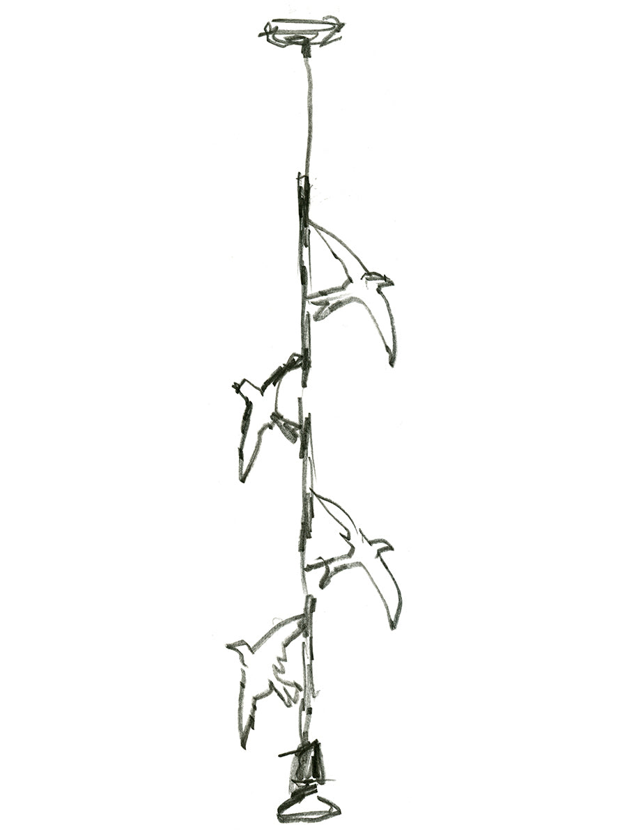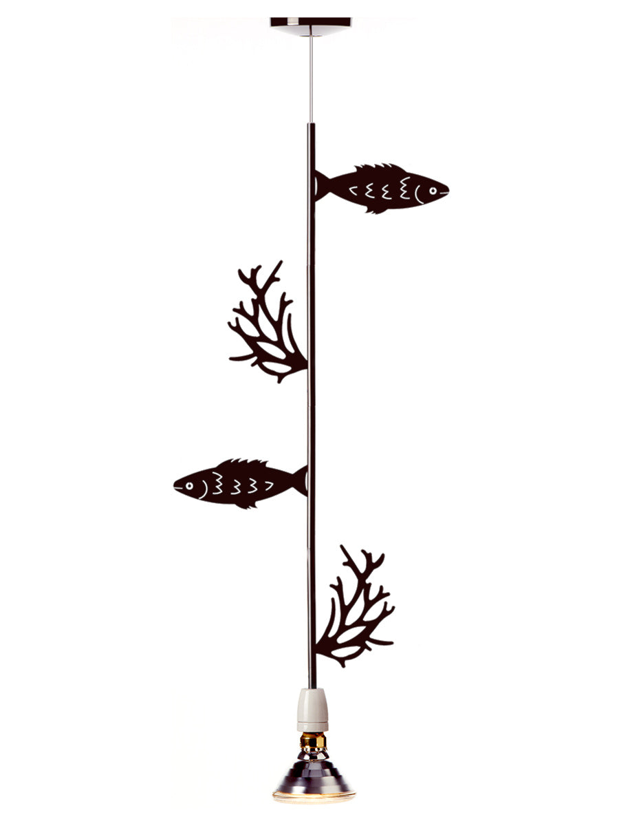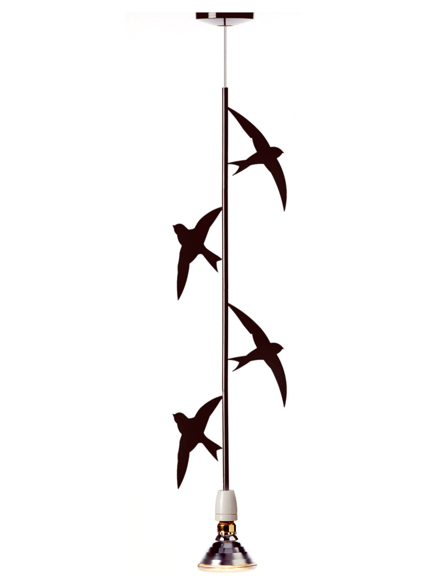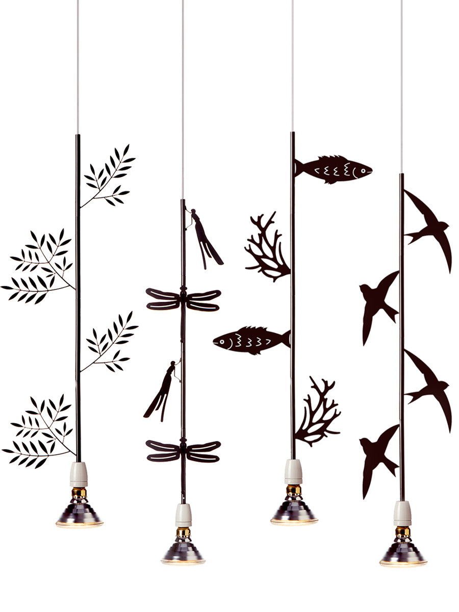 The Flora, Fauna, Ittica & Migrante pendant light collection from Produzione Privata is inspired by nature and takes the unique approach of re-defining the flex as opposed to the diffuser. This pendant light is composed of laser cut metal with a porcelain bulb socket. Available in four unique and delightful designs. Made in Italy.