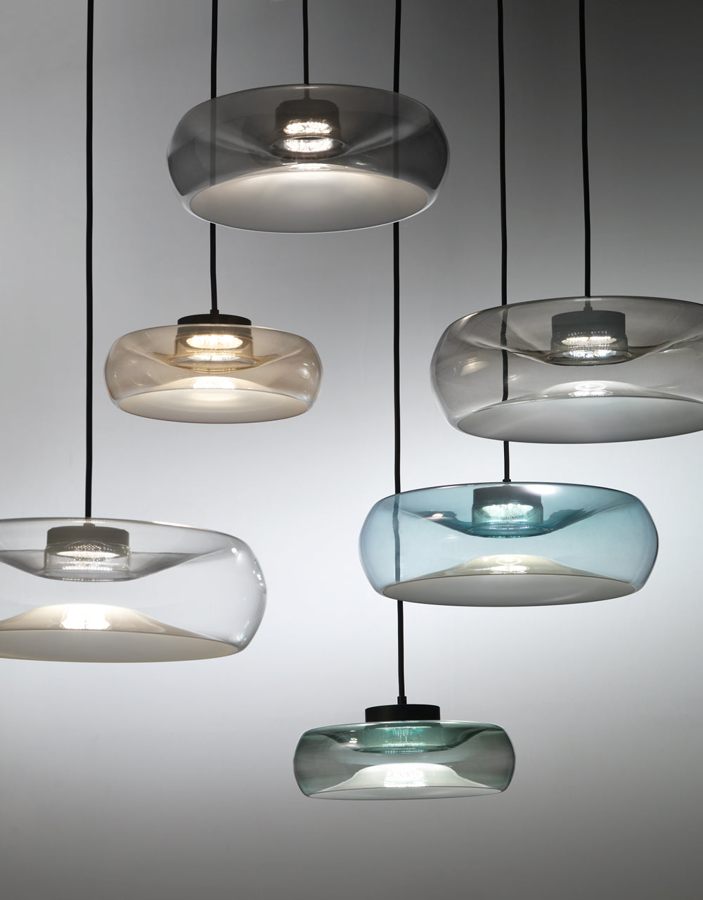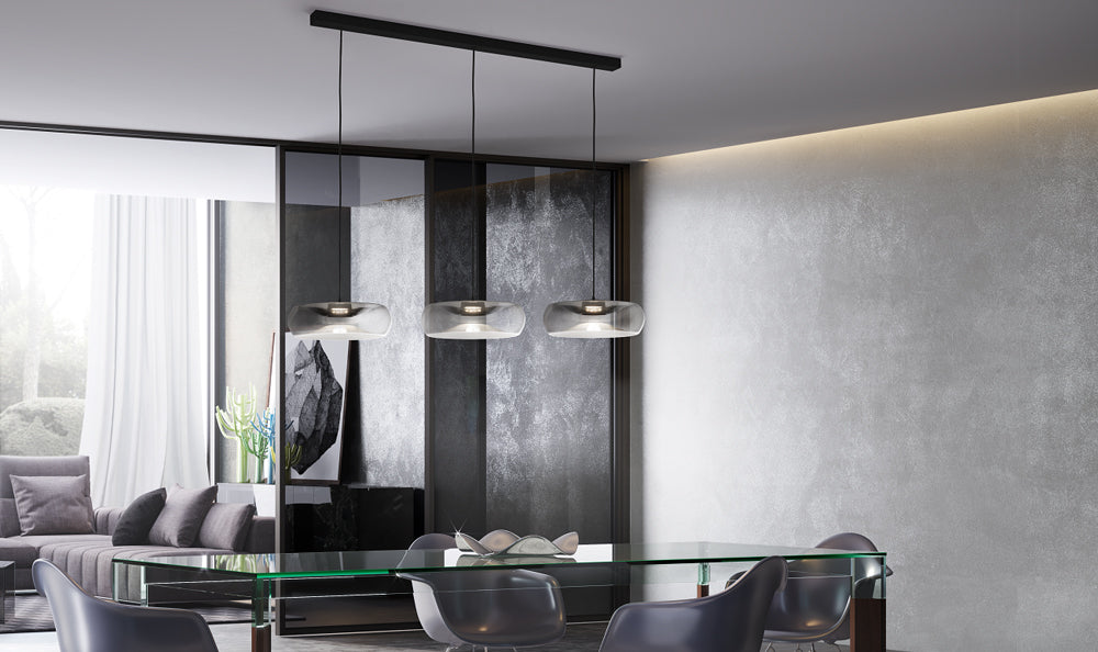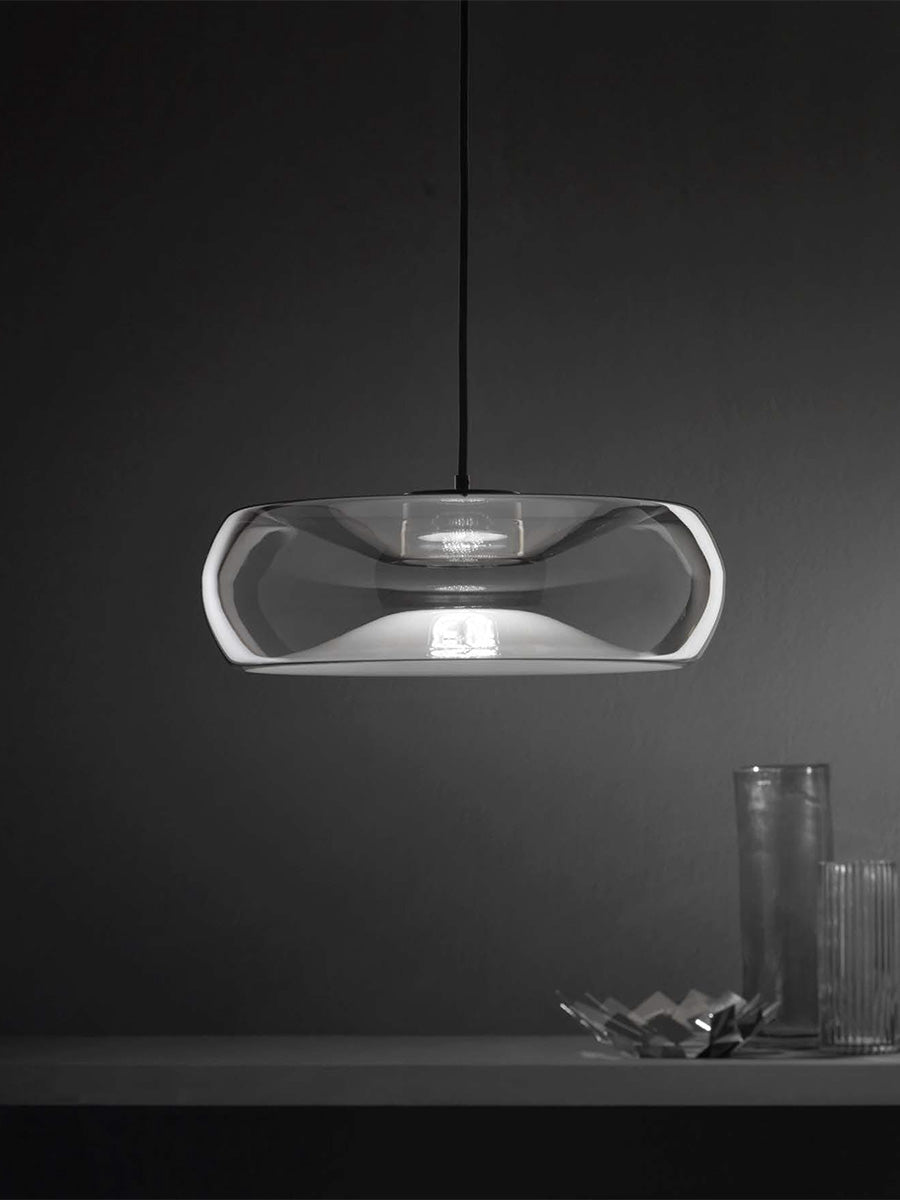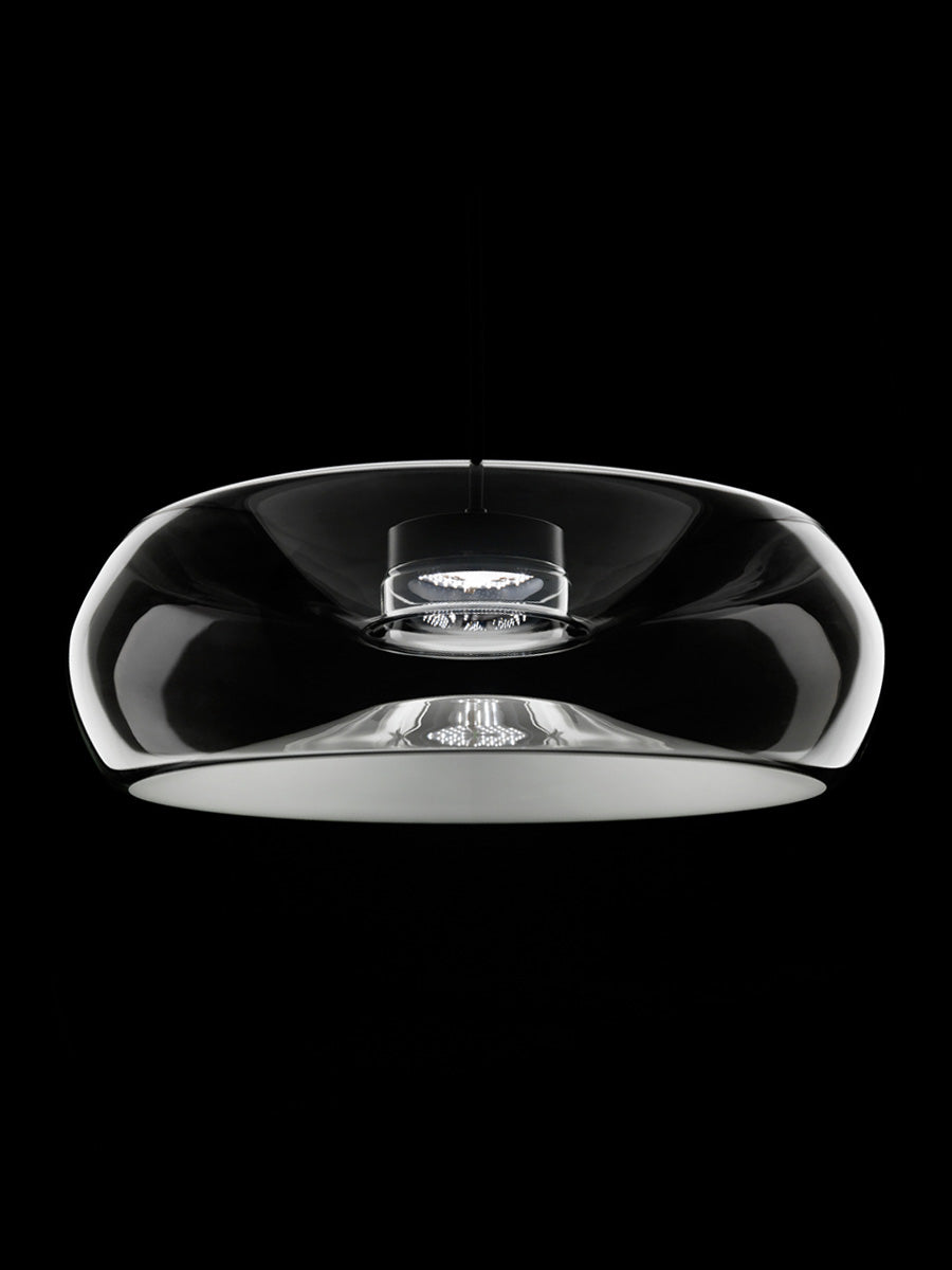 Fold by Cangini & Tucci produces a mirage of light through it's unique blown-glass design. Inspired by contrasts, Fold pendant creates an illusion of depth with a folded glass form which both conceals the in-built LED source and emits reflections between the top and bottom of the diffuser interior, producing a delicate glow within a space. Available in various sizes and a wide range of finish options with black or chrome metalware.