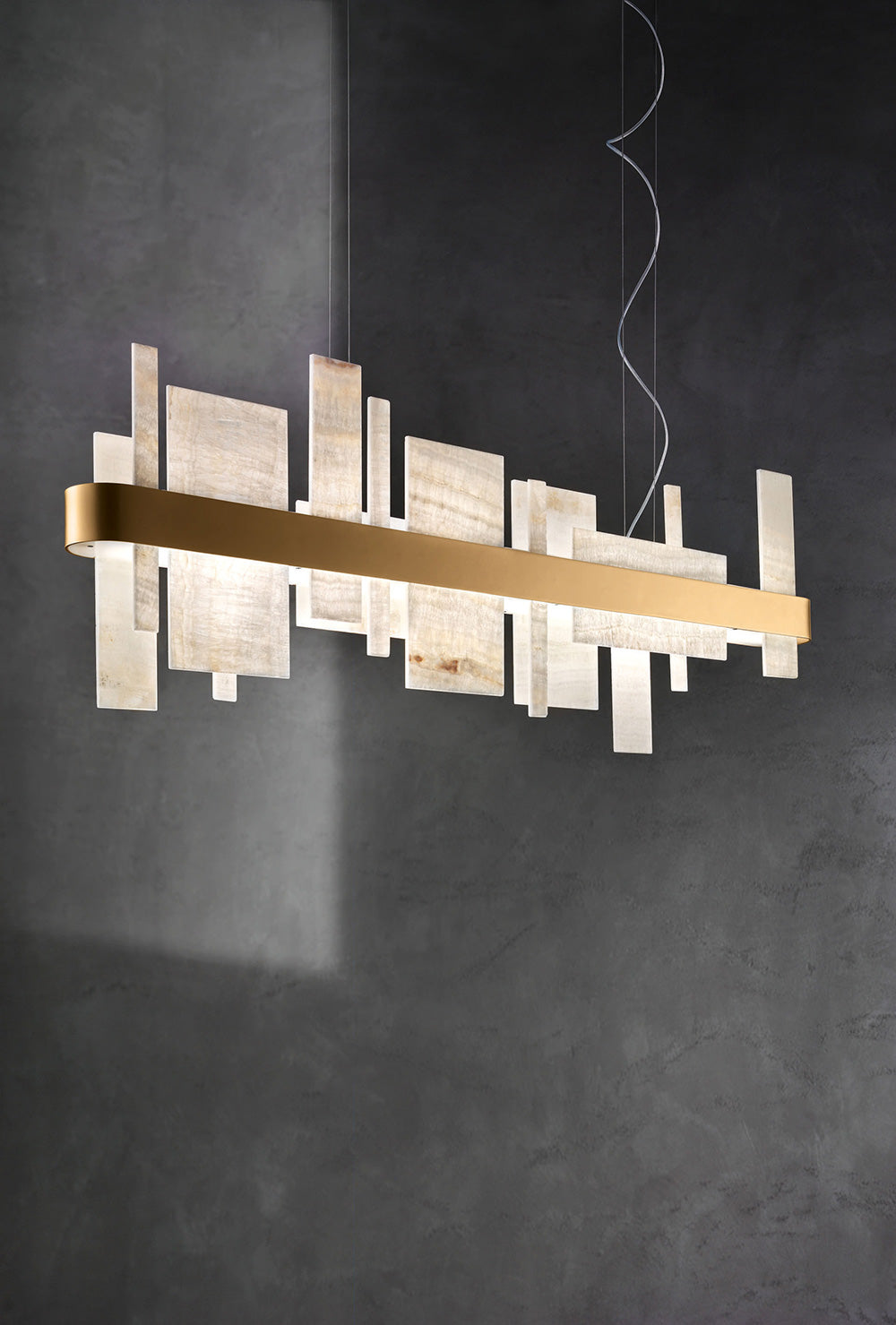 Inspired by the beauty of onyx, the Honice pendant light appeals with its high-quality, natural materials and a modern, asymmetrical design. Rectangular natural onyx diffusers of different sizes are vertically and horizontally attached to a linear frame with curved endings, while the frame itself is made of a band of metal with an opaque gold finish. Light shines upwards and downwards, providing direct and indirect illumination. Its warm tones and precious materials make Honice especially suited to elegant interiors, pairing well with dark wood tones and refined metals. Available in multiple size options. Designed by Oriano Favaretto.