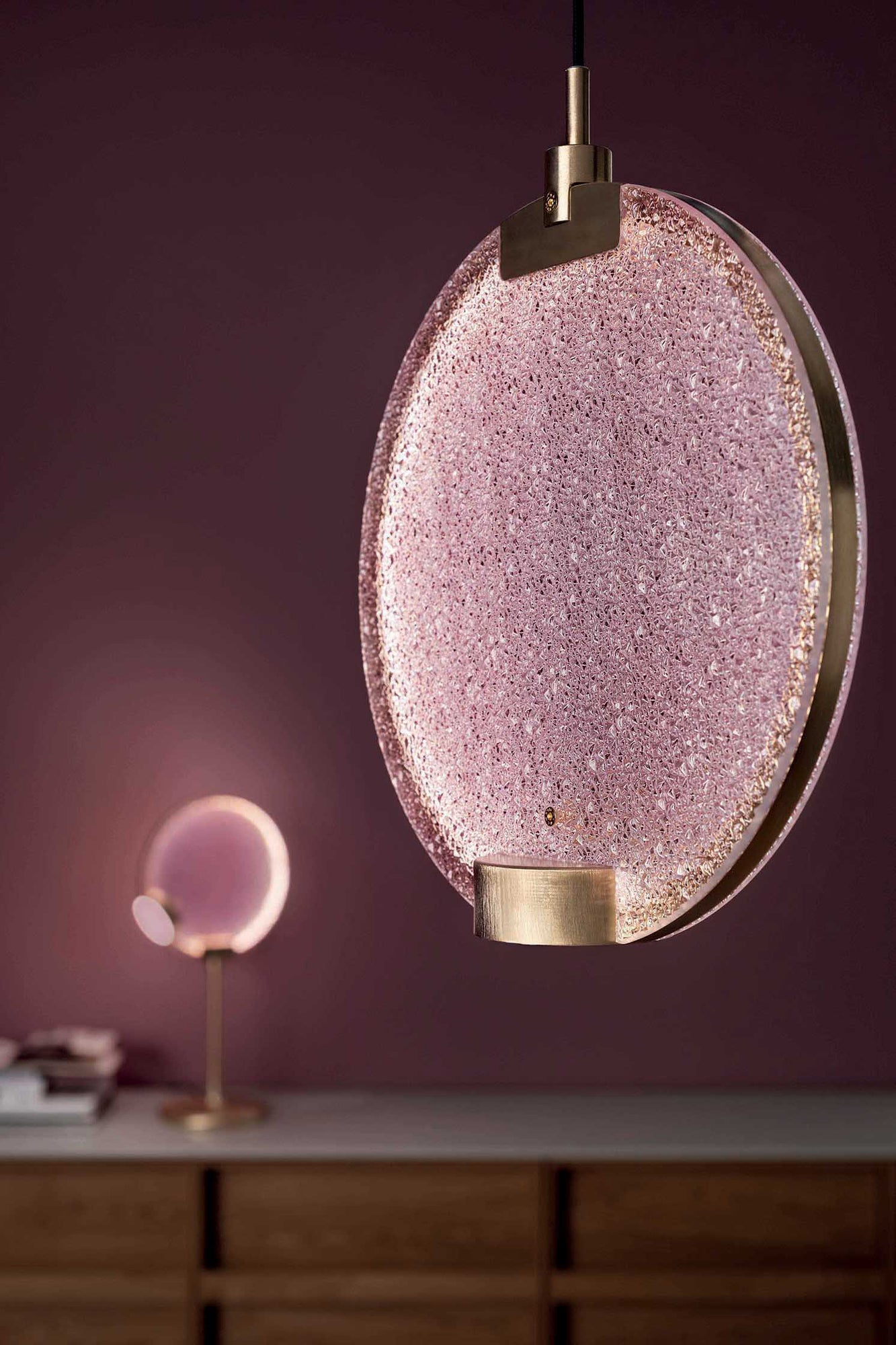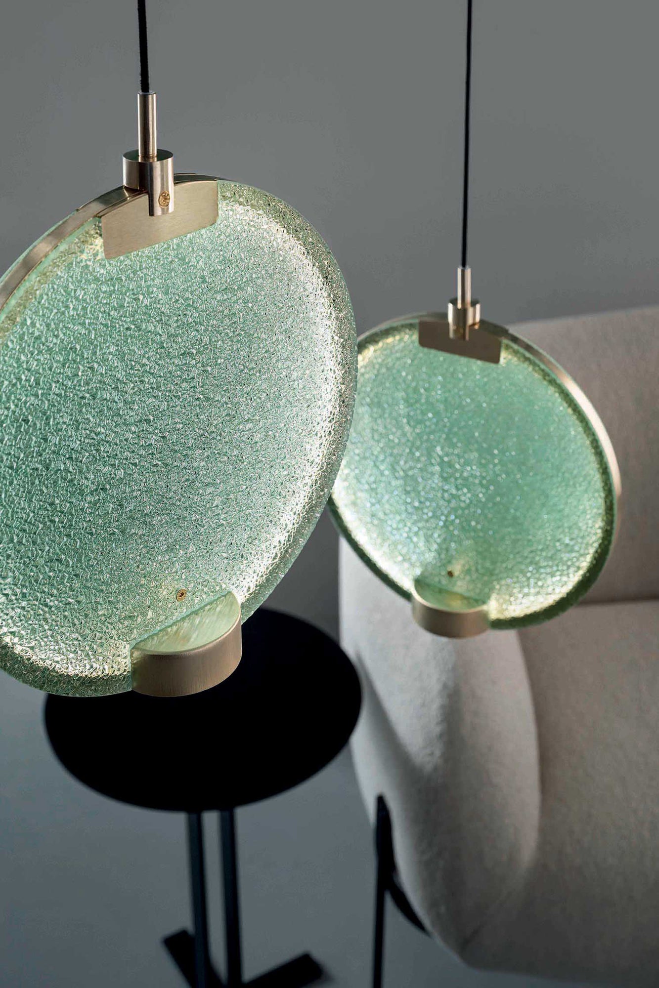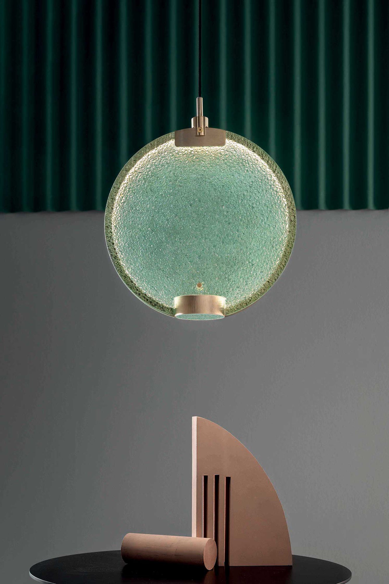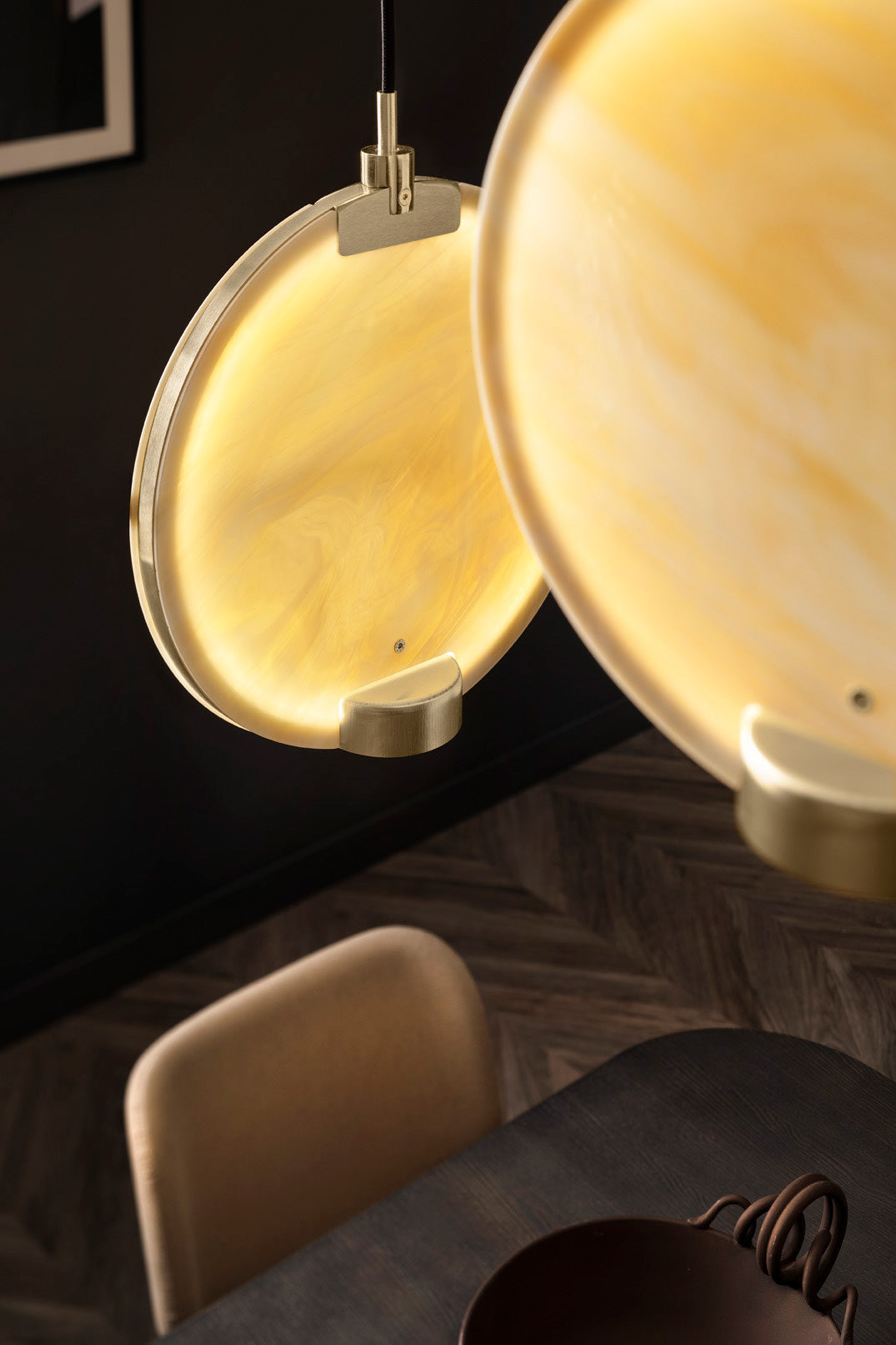 Horo is inspired by ancient depictions of the sun, including the sun god Ra, which gives the collection an enduring and ethereal quality. Available with clear or coloured prismatic glass and featuring brushed brass metal details. Designed by Pierre Gonalons and made in Italy.