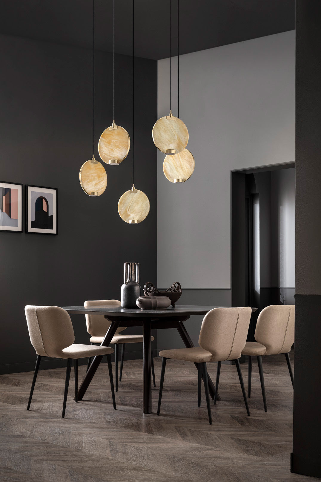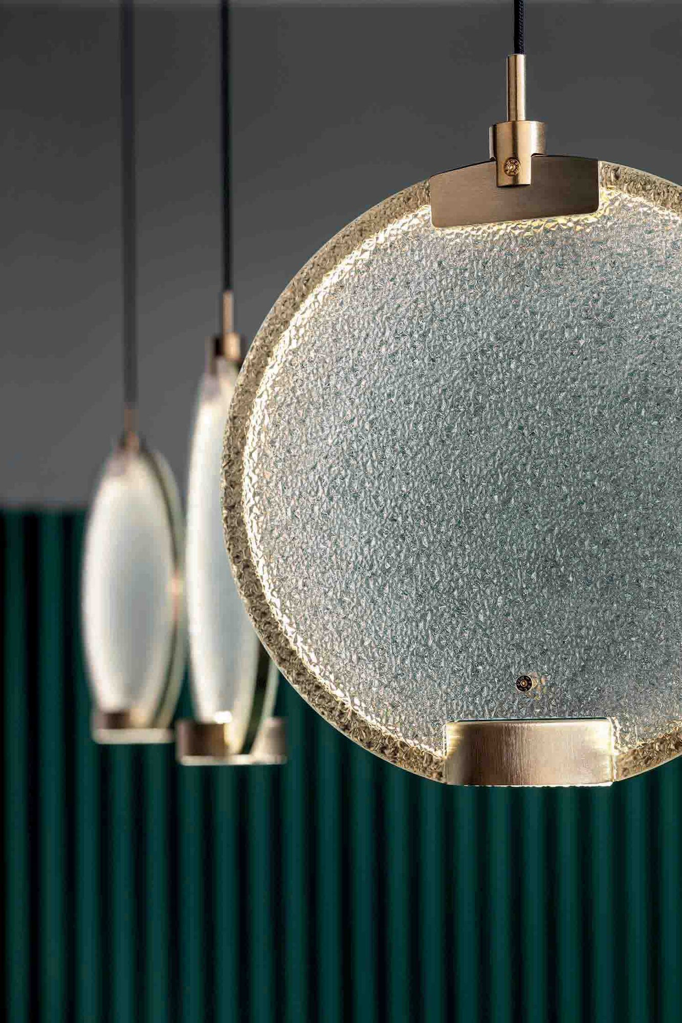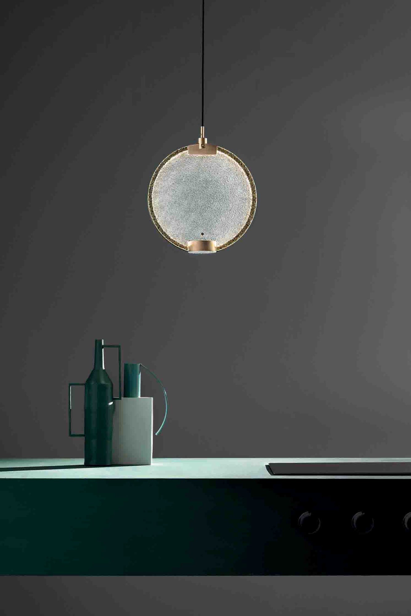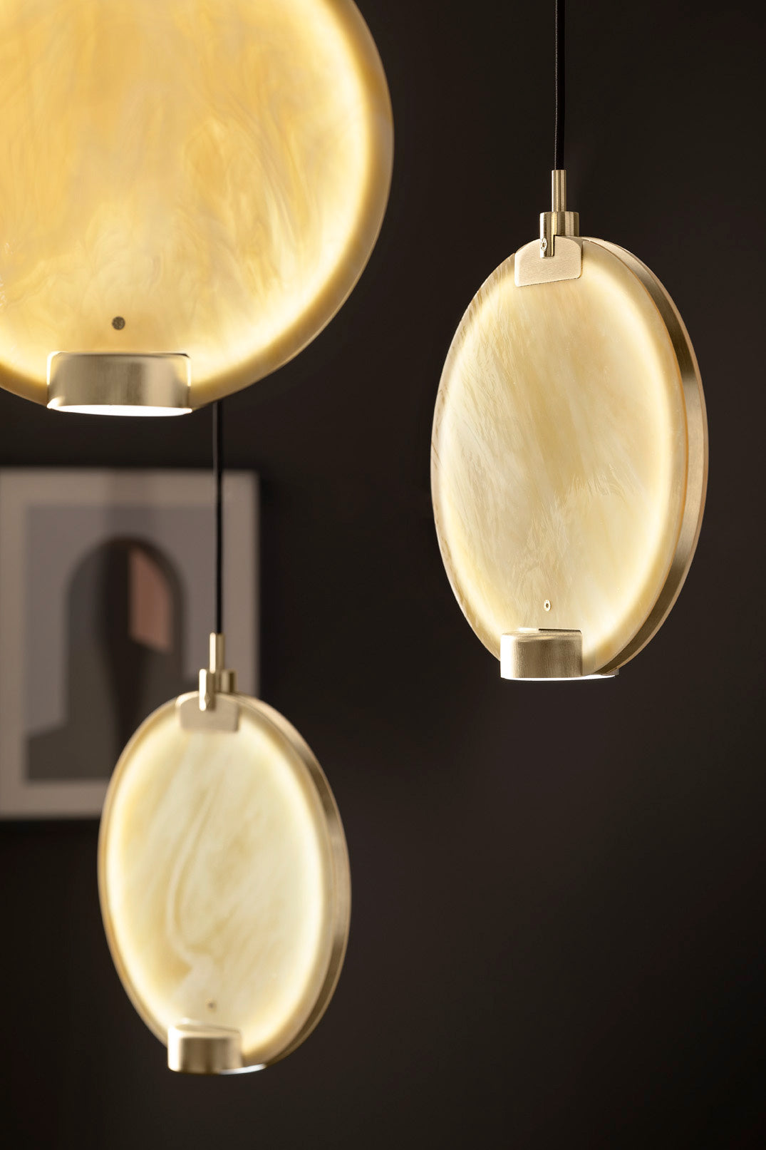 Horo is inspired by ancient depictions of the sun, including the sun god Ra, which gives the collection an enduring and ethereal quality. Available with clear or coloured prismatic glass and featuring brushed brass metal details. Designed by Pierre Gonalons and made in Italy.