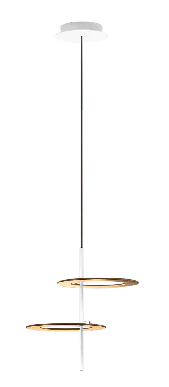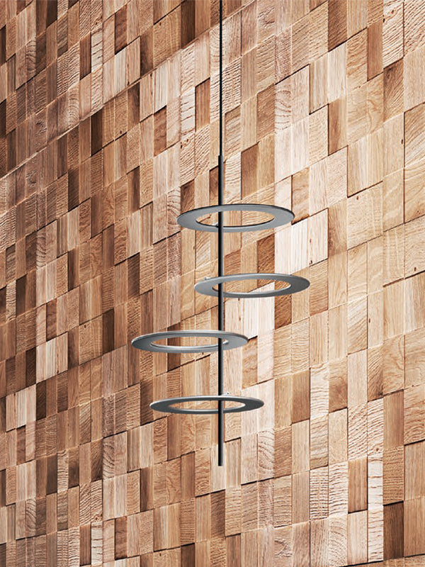Hula Hoop pendant light is a minimalist fitting with a high energy LED source for modern applications. The unique design evokes the illusion of metallic hoops floating around a central element, creating a striking accent within a space. Available as 2 or 4 hoop version in a variety of finishes.