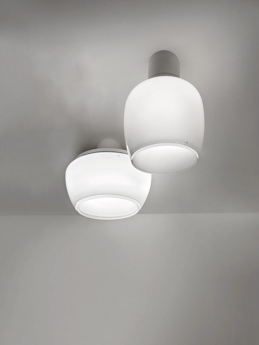 A collection which represents the illusion of a surface created by the implosion of a volume. Implode is made up of a gradation of multiple layers of white and transparent hand blown Italian Murano glass. Ceiling light available in two sizes. Design by Gregorio Spini for Vistosi.