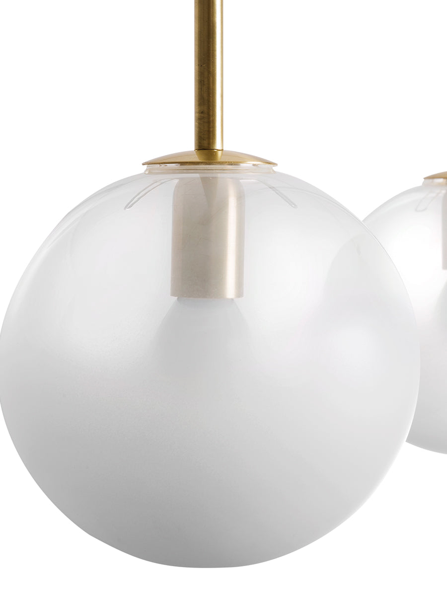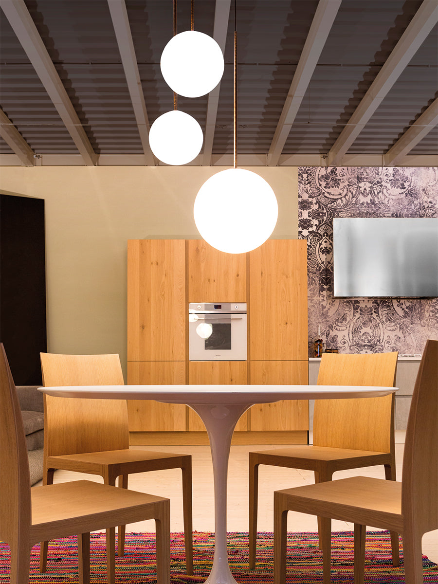 Inti takes inspiration from the Inca divinity of the sun of the same name. A classic pendant design, Inti is comprised of a blown glass diffuser and a brass structure for a striking contemporary contrast. The glass is treated with a gradient finish that goes from opaque white to transparent to reduce glare, allowing Inti to produce a soft, ambient light. Handmade in Italy.