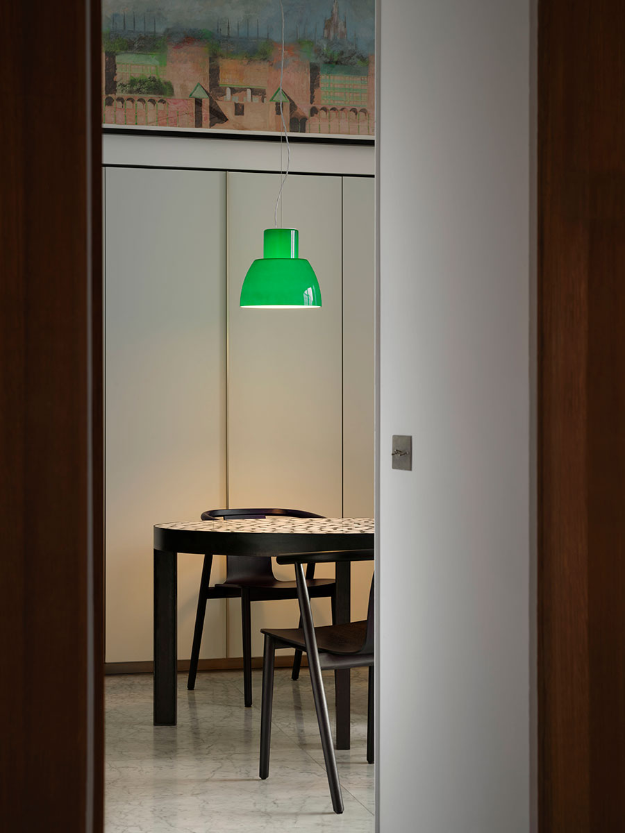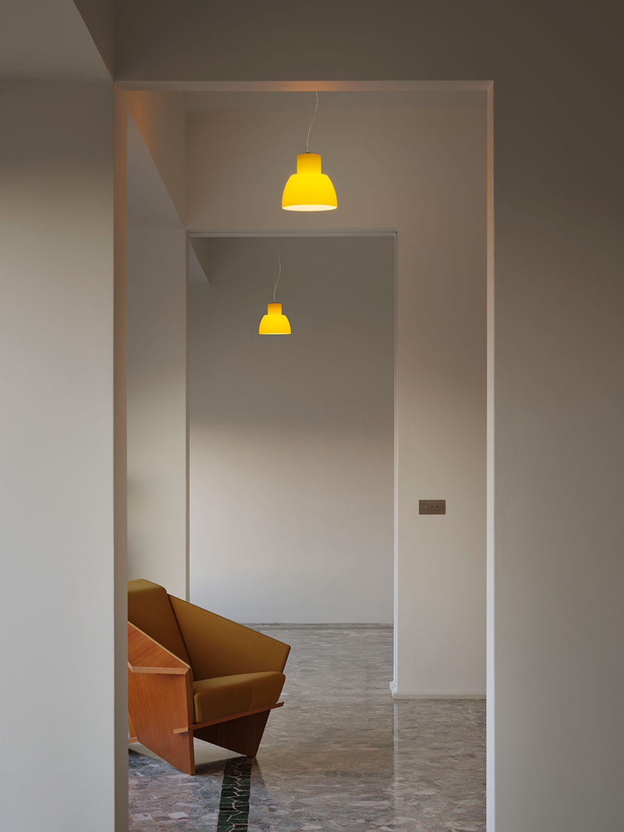 For his solo exhibition at the Basilica Palladiana in Vicenza 1999, Alvaro Siza created the Lorosae pendant light. This timeless design features translucent glass with a white inner diffuser to maintain the natural color of the light. Available in a range of vibrant finishes.