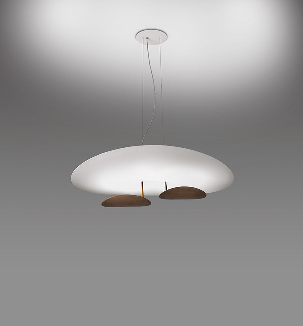 The peculiarity of MASAI is its curved shield on which the light is projected from an oval source. This collection of indirect wall, ceiling and pendant lamps consists of slimline die-cast aluminum profiles with inbuilt LEDs. The simple geometry and essential shape of MASAI creates a clean and sophisticated aesthetic, while its soft indirect lighting produces a comfortable atmosphere. The Masai pendant light is available in two sizes in a variety of finish options. Made in Italy.