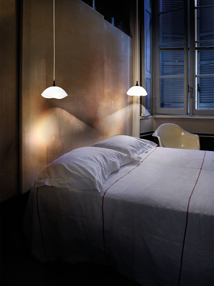 The Ninfea Pendant by Vistosi amazes with its unique shape made from hand worked Murano glass. Ninfea is available in small or large size in white finish.