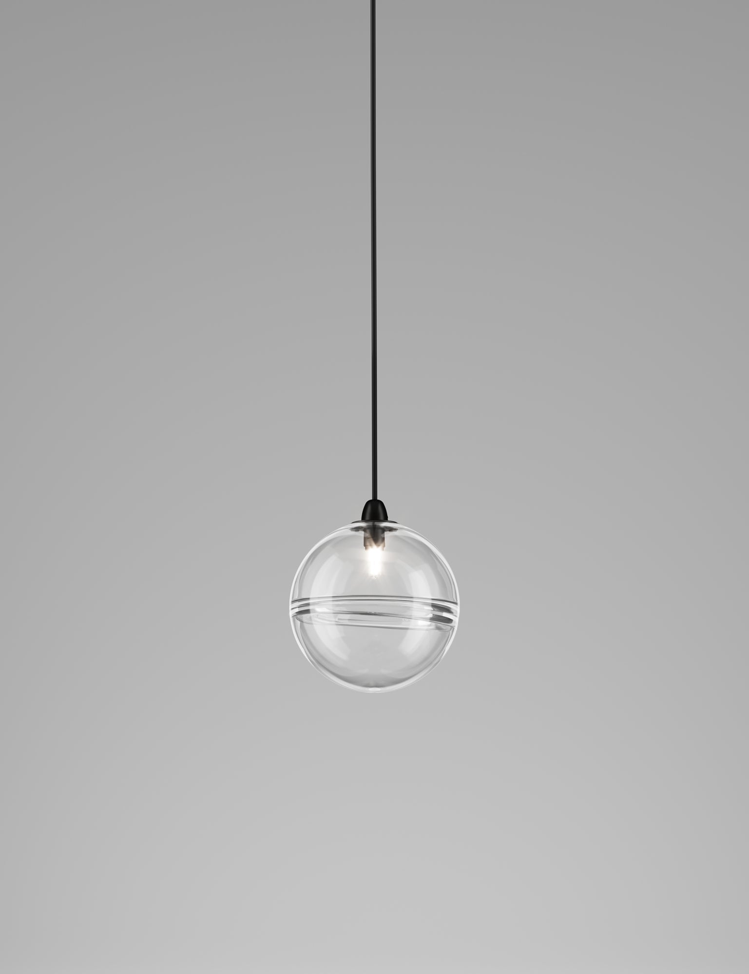Sky and earth join at a horizon of colour in Oro suspension lamp from Vistosi. The internal membrane which distinguishes the two halves of the sphere takes on ever-changing curves, making the intensity of light and colour emission unique from Oro to Oro. Made from mouth blown glass and available in various finish options with in-built LED or G9 source.