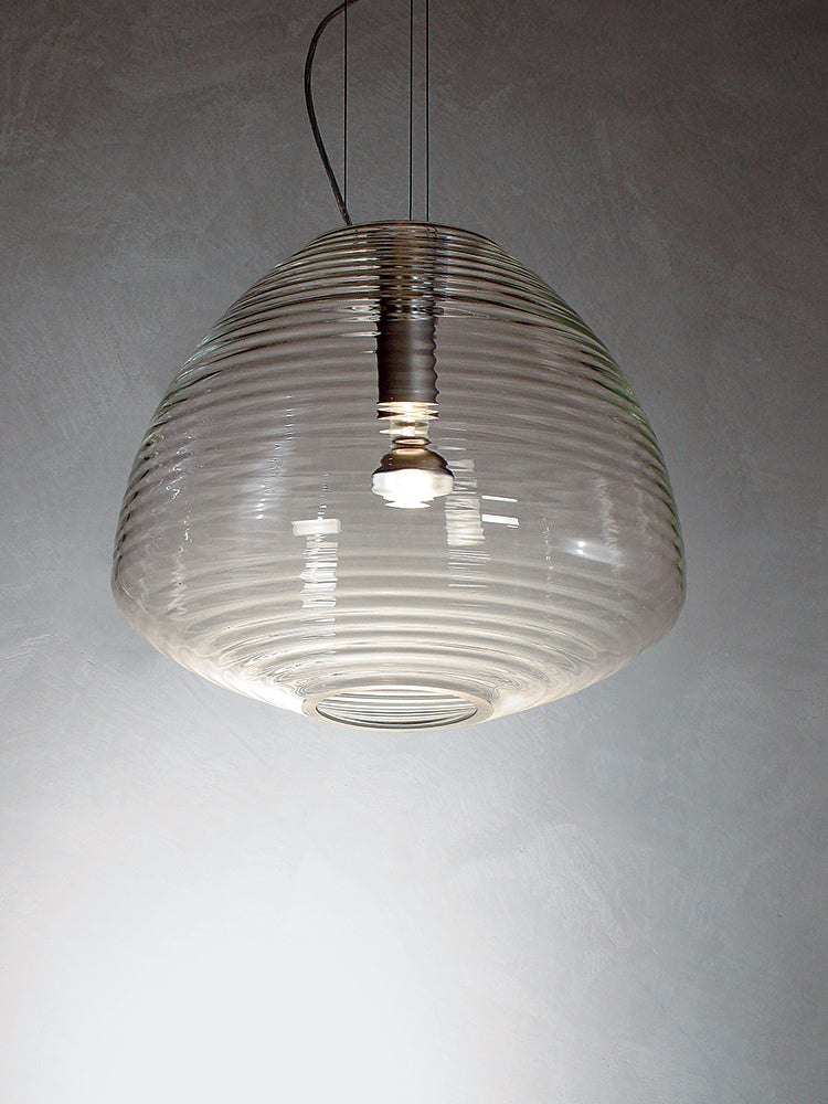 The Perseo pendant is inspired by the look and feel of Japanese paper lanterns. The rounded blown glass diffuser is masterfully crafted with faceted surfaces evoking the sculptural tastes of Isamu Noguchi and his work. Perseo is available in three sizes in satin white or transparent finish. Design by Michele De Lucchi.