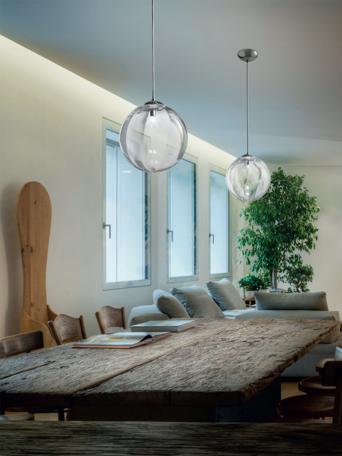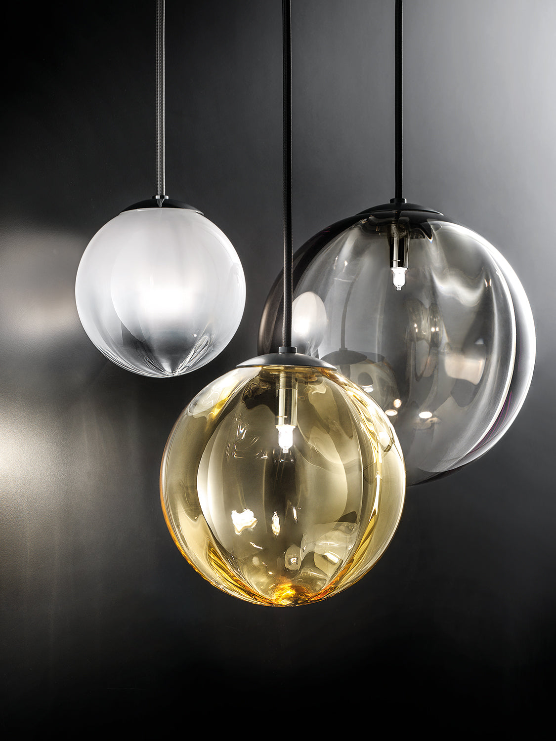 Simple and elegant, the Puppet Single Pendant is perfect for contemporary spaces. A hanging mouth blown glass diffuser features an irregular lined degrade finish, producing a soft cloudy pattern on surrounding surfaces. Available in a variety of colours and small, medium, or large sizes.