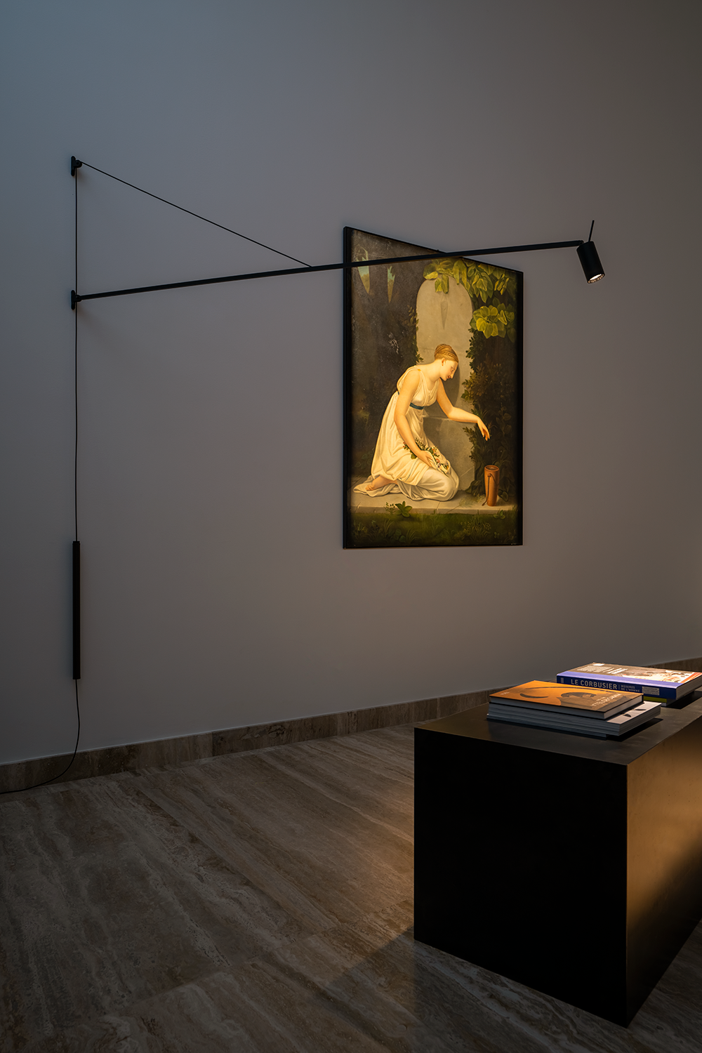 Swan is a dimmable LED wall light for direct lighting. Comprised of a single arm which rotates 40 degrees vertically, with a leathered counterbalance, and 180 degrees horizontally. Its directable cylindric head provides flexibly to orientate the light beam, with optional honeycomb filter for antiglare. The minimalist aluminium structure is painted matte black for contemporary installations. Comes with 3.5m of cable with an inline dimmer switch.
