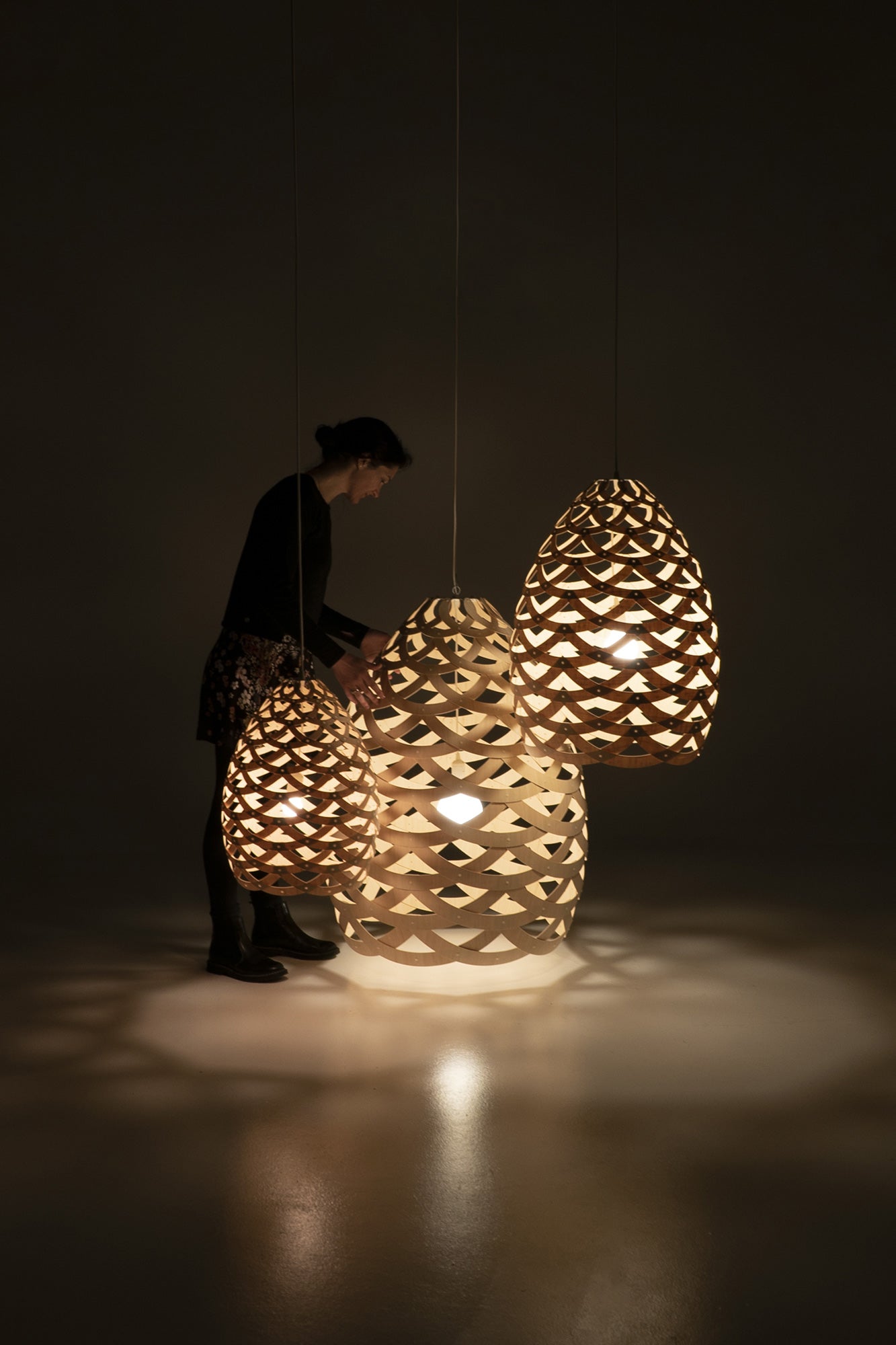 Tui by David Trubridge is named after the native Aotearoan bird which inspires it's design. Just like the intricate plumage found around the birds' neck, bamboo half-rings are woven into a basket form. Tui would sit perfectly over a dining table, kitchen counter or equally hanging in a stairwell or entrance. Available in the full range of Trubridge finishes in small, medium, and large size.