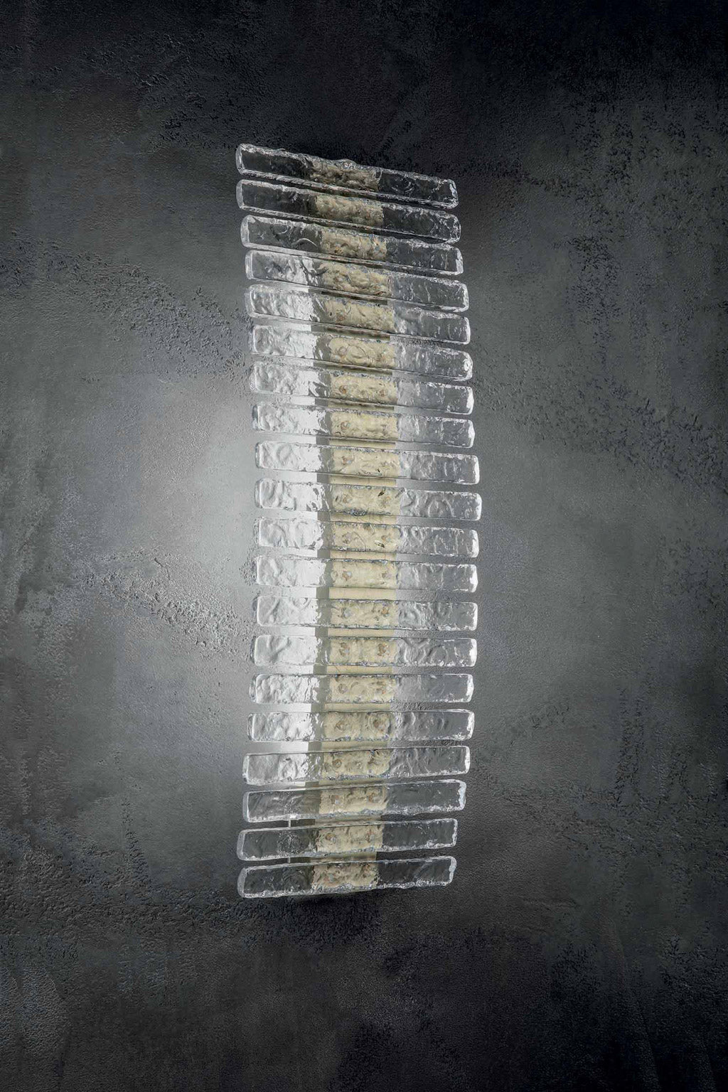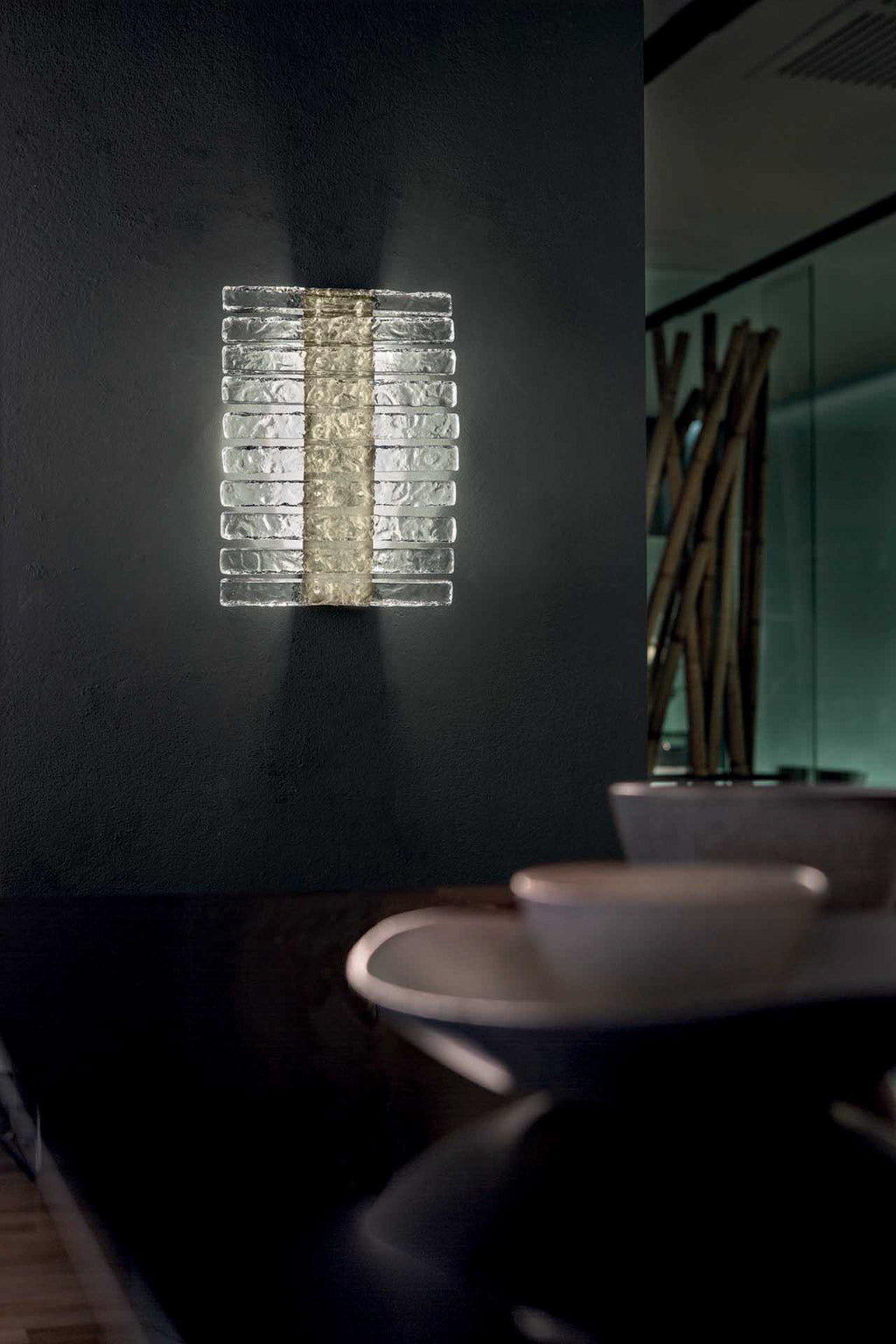 Vegas is loosely inspired by the architecture of Las Vegas, the city that never sleeps. The Vegas wall light expertly incorporates geometric forms, high-quality materials and cutting-edge manufacturing techniques to create a piece that reinterprets classic Art Deco style in a contemporary key. Hand-made glass pendants with rock-like details make up the diffuser, while a champagne-leaf metal frame provides an elegant base housing an in-built LED source. Perfect for feature lighting applications, Vegas is available in a variety of sizes. Designed by Marc Sadler and made in Italy.