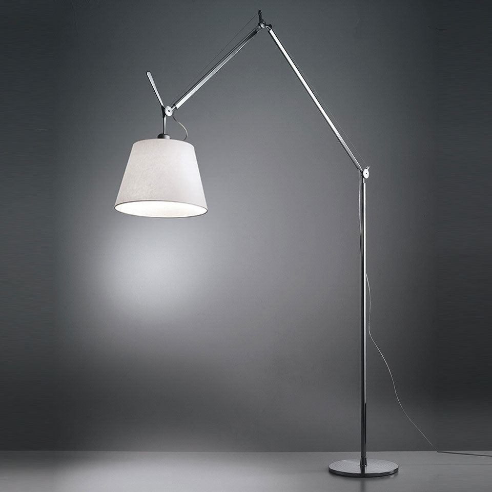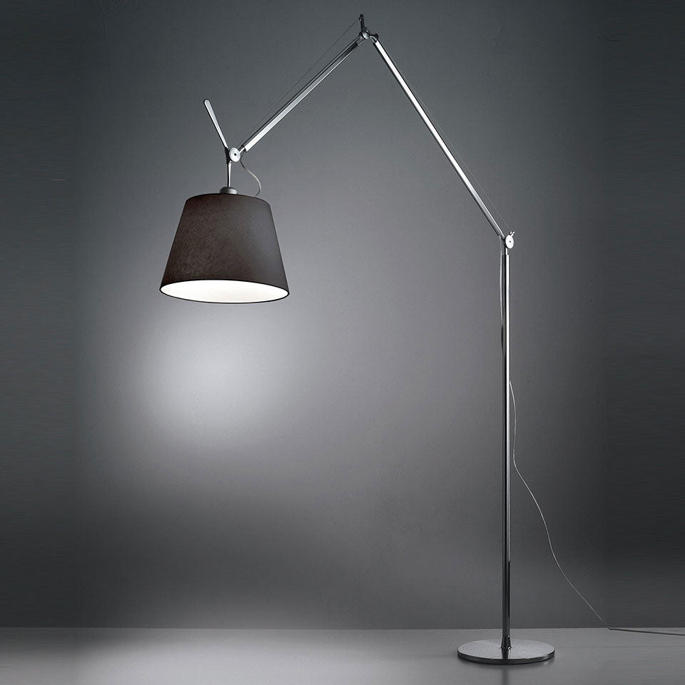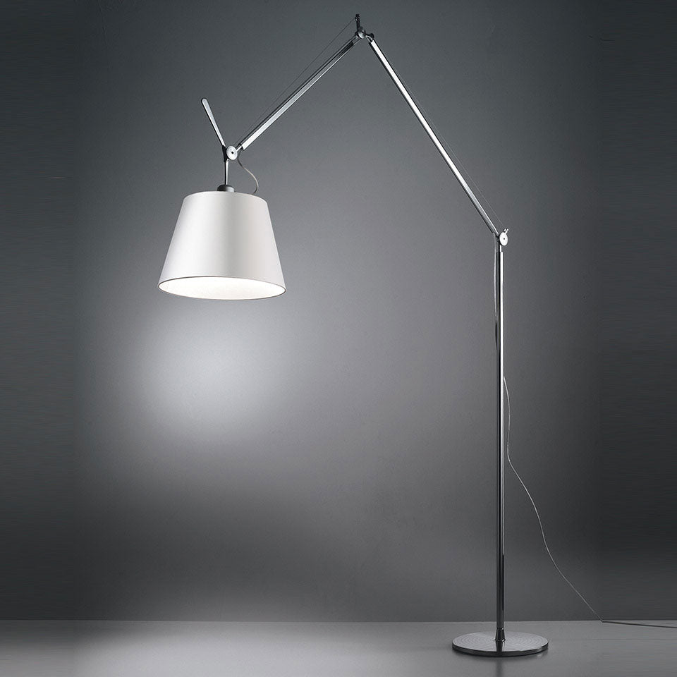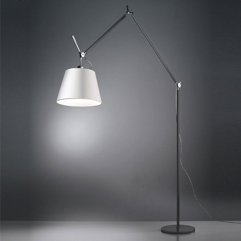 A timeless icon of Italian design, the Tolomeo Mega LED Floor Lamp by Artemide was originally conceived by Michele De Lucchi and Giancarlo Fassina in 1987. Celebrated for its perfect balance of minimalist aesthetics and exceptional functionality, the Tolomeo's articulated aluminium arm uses an innovative spring mechanism to allow effortless adjustment in height and direction. The Mega version replaces the classic aluminium head with a generous fabric diffuser that casts a soft, ambient glow - available in parchment, grey satin, or black fabric, and offered in three shade sizes to suit the scale of any space. The structure is available in polished aluminium or black. This LED variant delivers the same iconic form with modern energy efficiency. Equally at home in expansive residential living rooms, hospitality venues, or commercial interiors, the Tolomeo Mega LED is part of one of the world's most awarded lighting collections. Made in Italy by Artemide.
