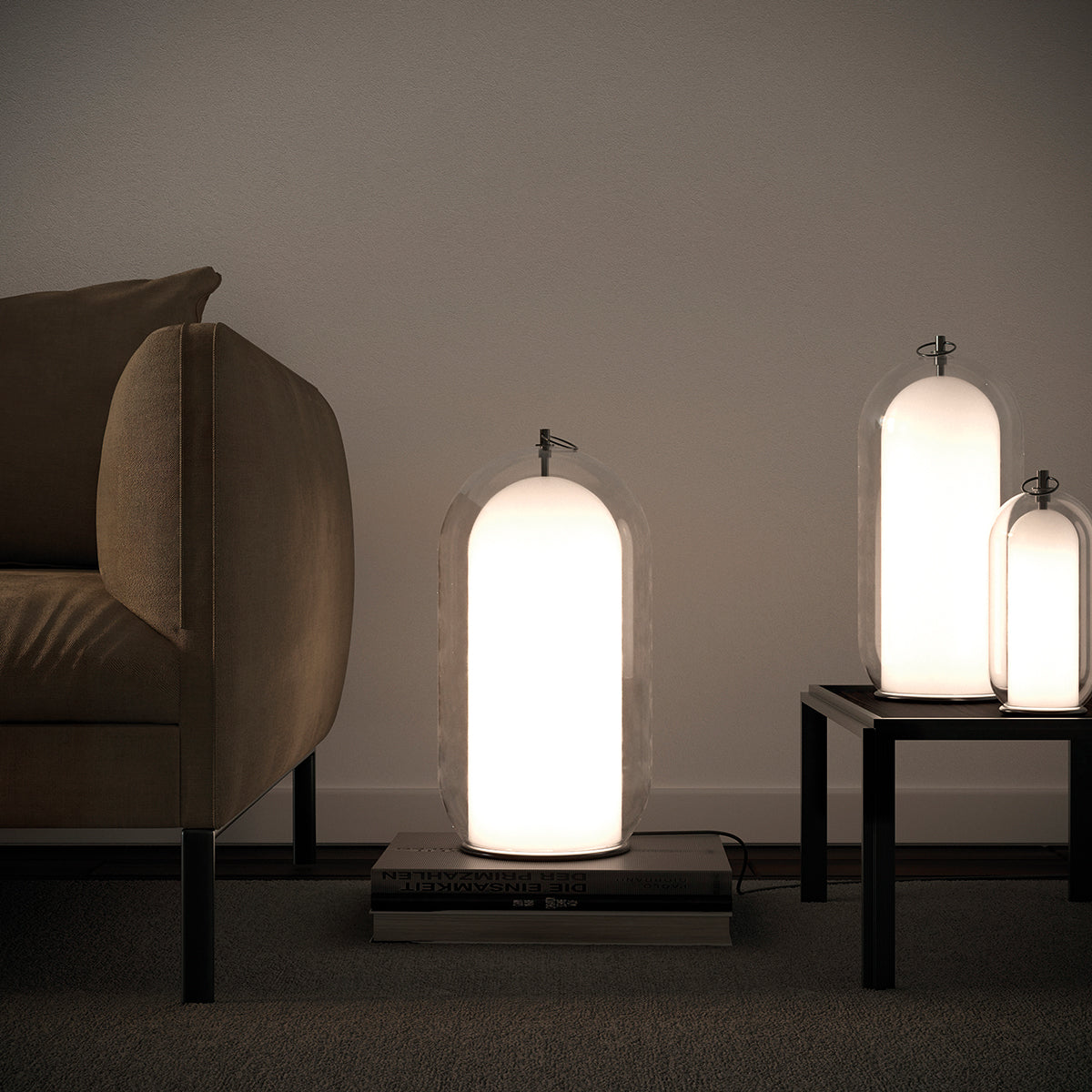 The Aeron table lamp by Cangini e Tucci is characterised by its double-chamber diffuser. Made entirely of mouth-blown glass, the satin-finished inner chamber softly diffuses the light source, producing a natural and even illumination. The outer chamber and metal structure are available in a wide variety of finishes to suit any decor. The lamp features a top mounted metal ring for convenient positioning.