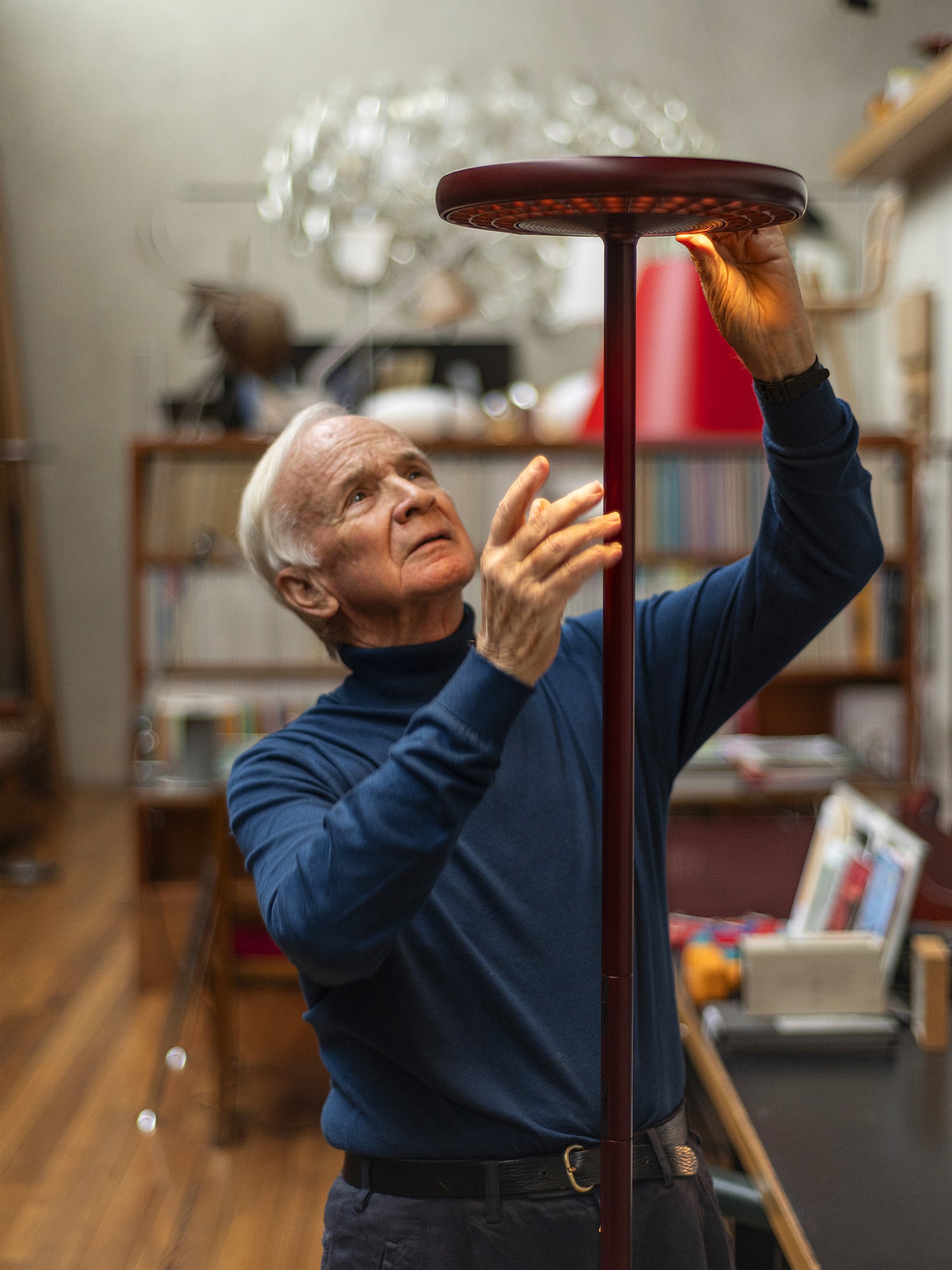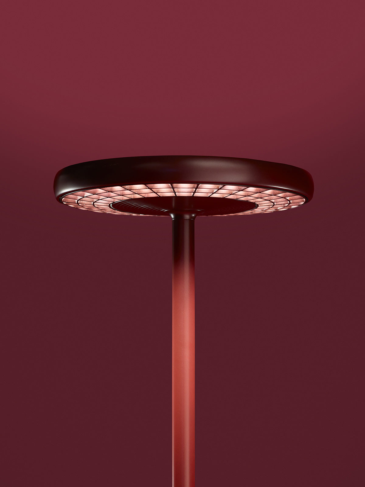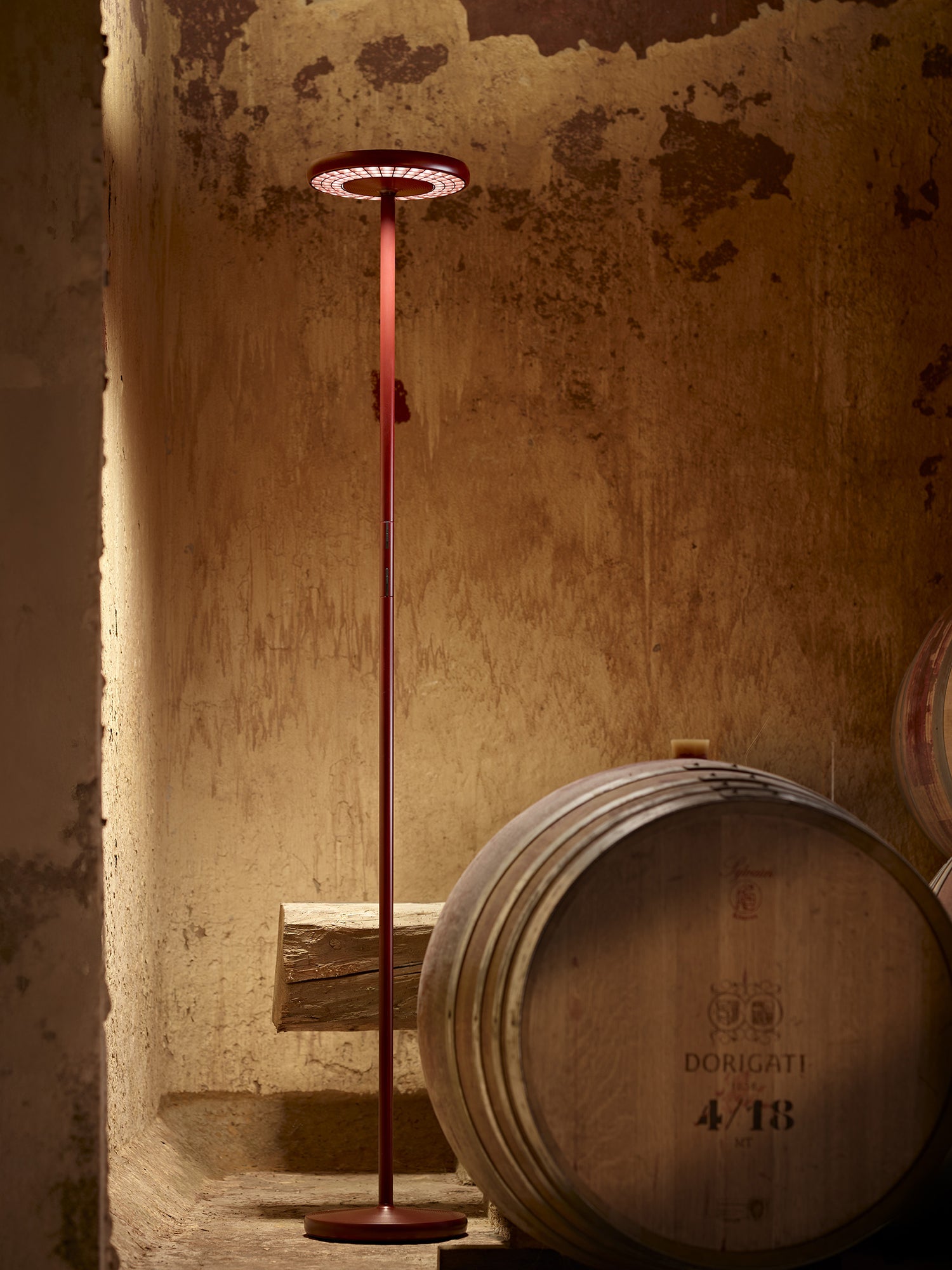 Paolo Rizzatto's SOL floor lamp adorns a new color conveying passion, land, and tradition. The colour ROSSOMOSTO, a dark and deep burgundy, is inspired by the Rotaliana Plain, the beating heart of wine production in Trentino, Italy and where manufacturer Rotaliana resides.