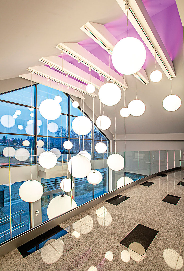 The simplicity of a luminous globe can create an elegant atmosphere in indoor and outdoor settings. The essential design of the Globo family of hanging lamps are perfectly suited to minimalist contemporary projects. Globo lamps can create a unique luminous effect, particularly when various sizes are installed in close proximity. Available in 60cm and 80cm size (more sizes available on request). White finish with 3m of transparent cable.