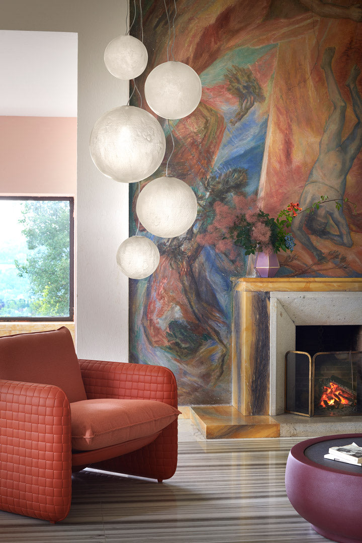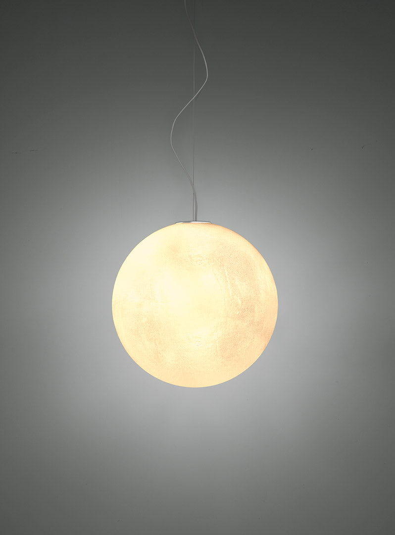 Murano is a hanging lamp inspired the ancient tradition of glass making. With a special blend of SAN (styrene-acrylonitrile resin), Murano has the iridescence of glass thanks to a hand flaming process at the end of production. Warm light radiates uniformly through the transparent material. Available in three size options.